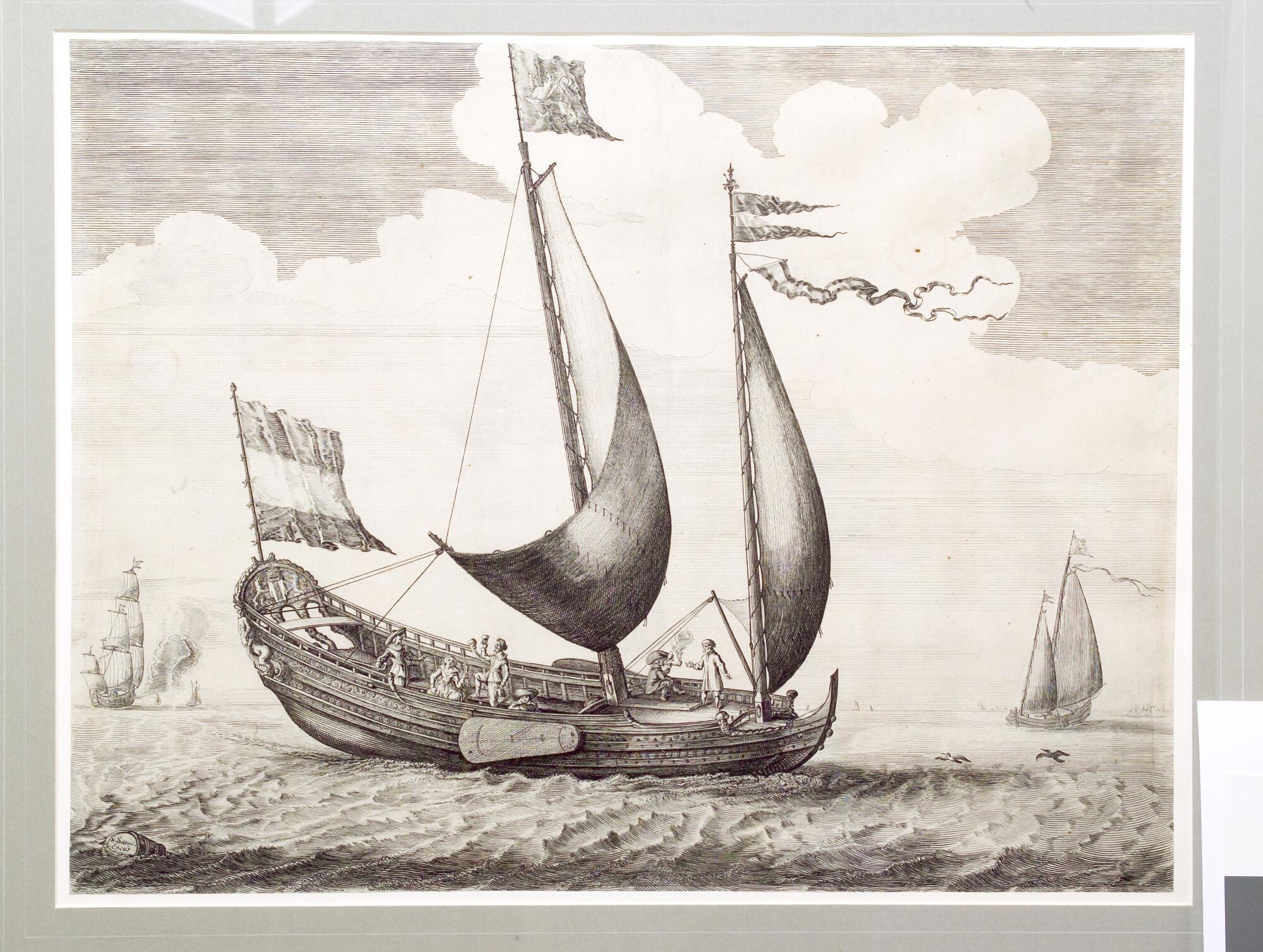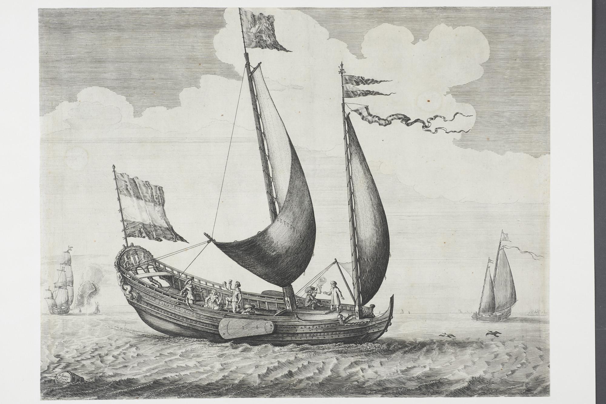 Een speeljacht onder zeil met feestvierend gezelschap aan boord.