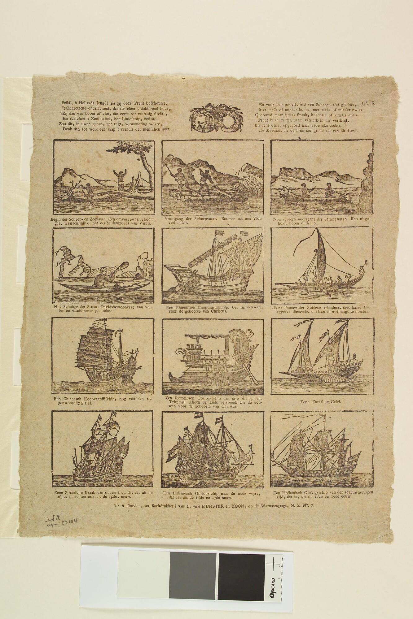 Berijmde kinderprent over de historische ontwikkeling van het schip, van boomstam tot negentiende-eeuws oorlogsschip, in twaalf afbeeldingen met vignet van de Maatschappij tot Nut van 't Algemeen.