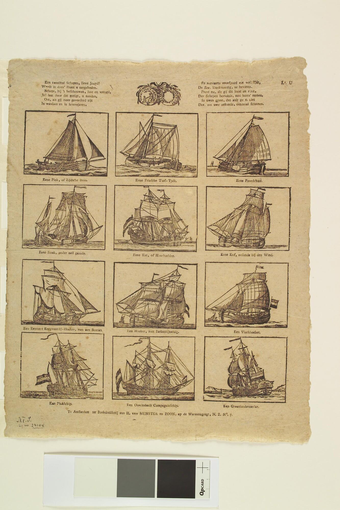Berijmde kinderprent over de historische ontwikkeling van het schip, van boomstam tot negentiende-eeuws oorlogsschip, in twaalf afbeeldingen, met vignet van de Maatschappij tot Nut van 't Algemeen.