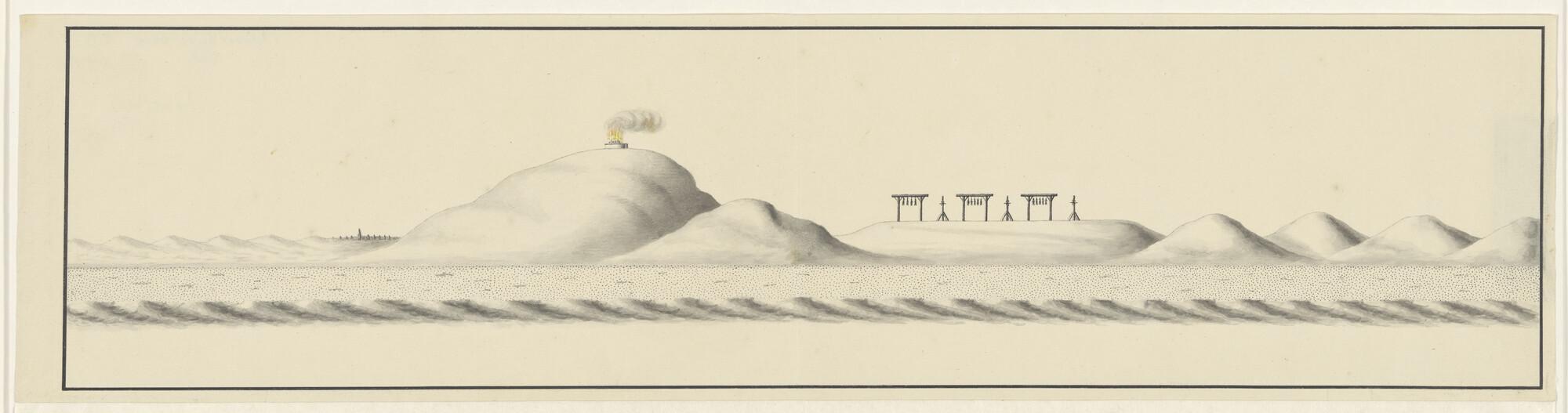 Lichamen van de muiters van het Oostindisch Compagnieschip "Nijenburg" ten toon gesteld in beugels en op palen bij Kijkduin.