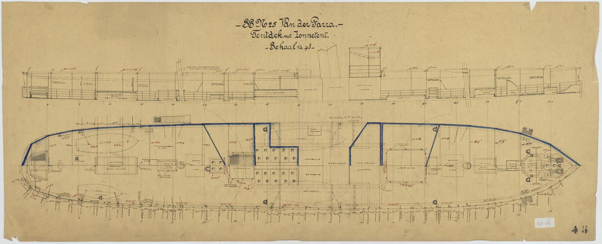 Tentdek met zonnetent van het vracht- en passagiersschip Van der Parra van de Koninklijke Paketvaart-Maatschappij (schaal 1:48).