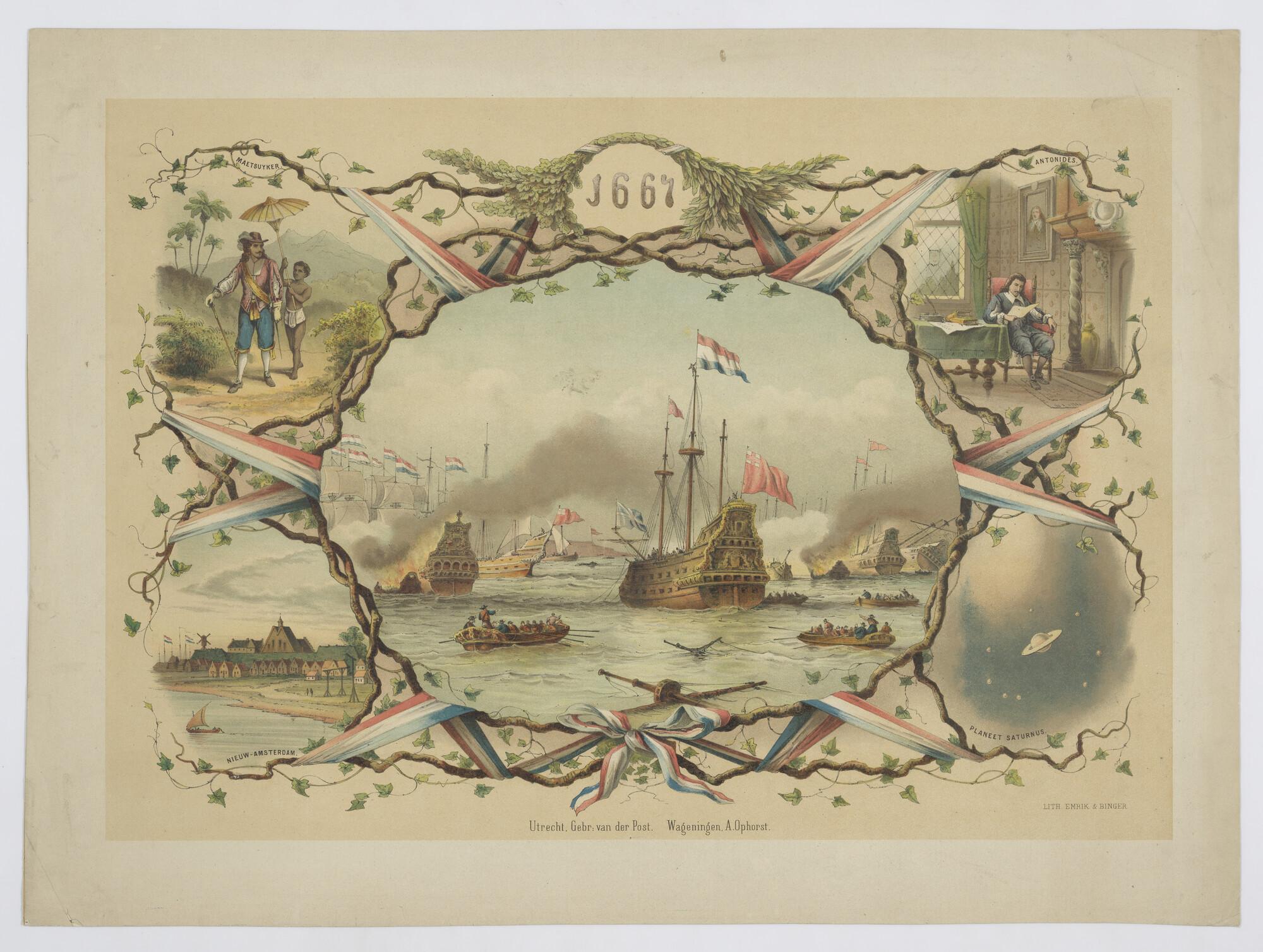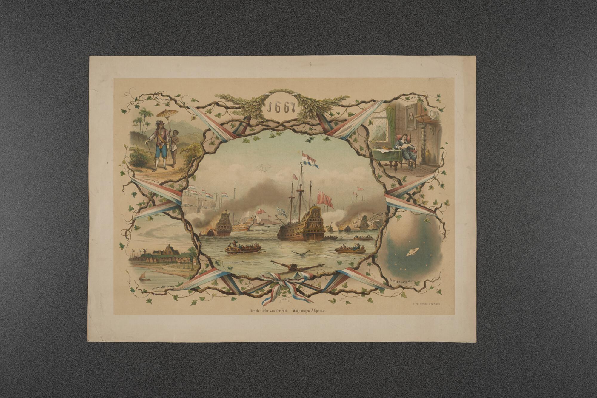 Affiche ter gedenking van de slag bij Chatham en de verovering van de Royal Charles in 1667. In de vier hoeken staan afbeeldingen met andere associaties met 1667: Joan Maetsuycker (gouverneur-generaal voor de VOC in Indië), de dichter Antonides (die dat jaar twee gedichten schreef op de oorlog), Nieuw-Amsterdam (dat aan Engeland werd overgedragen) en ...