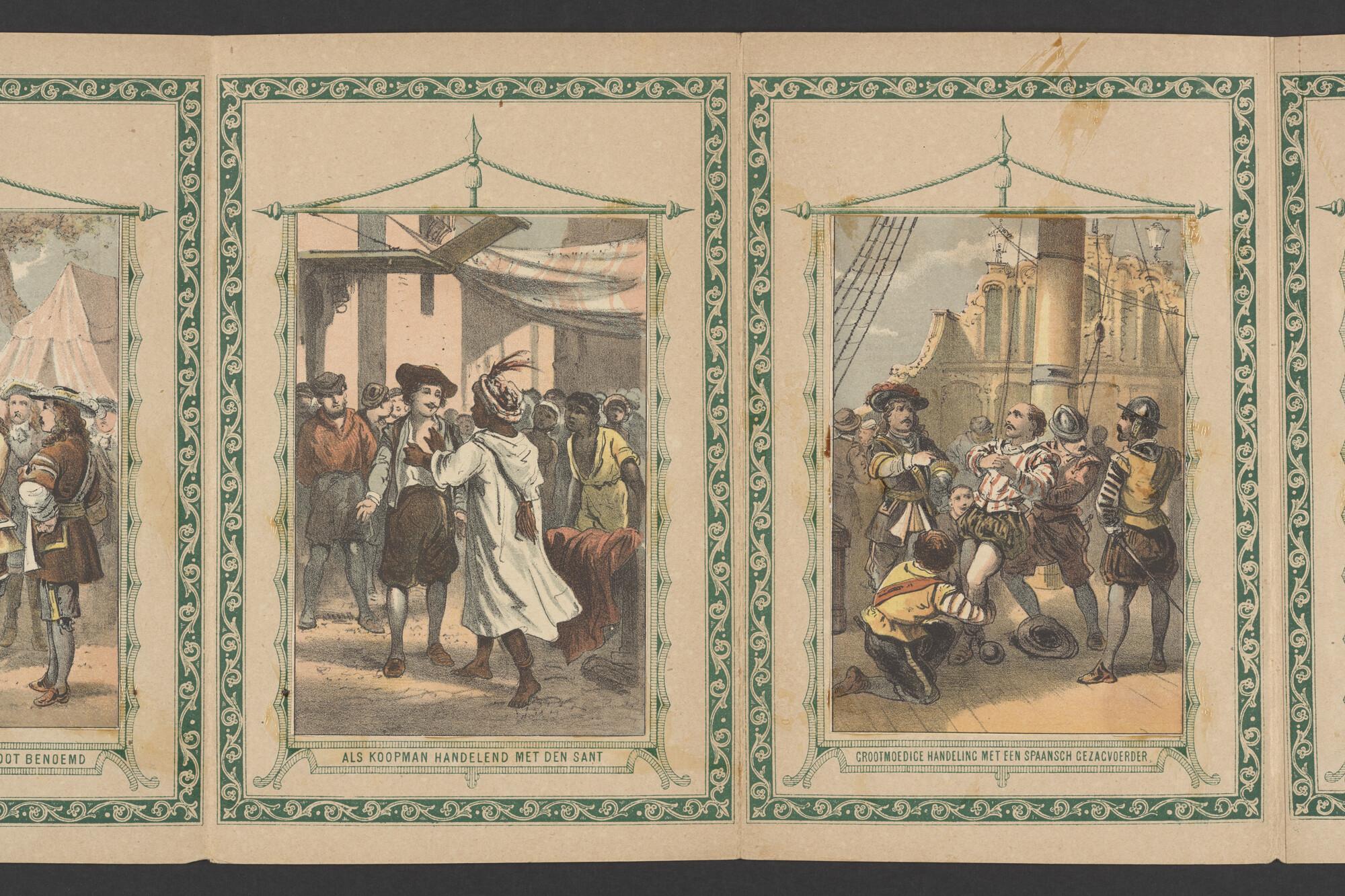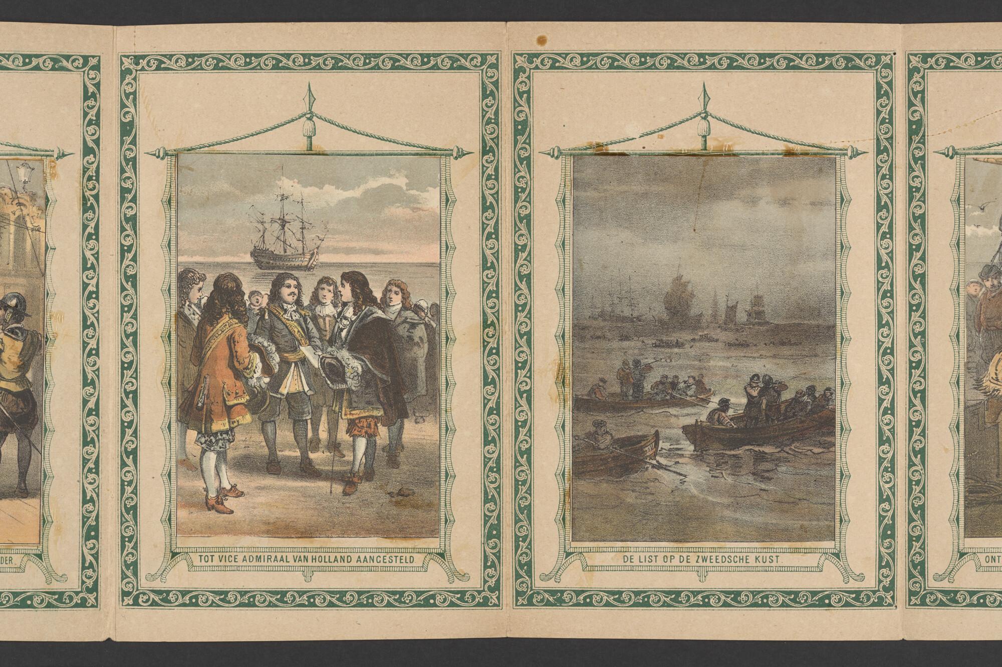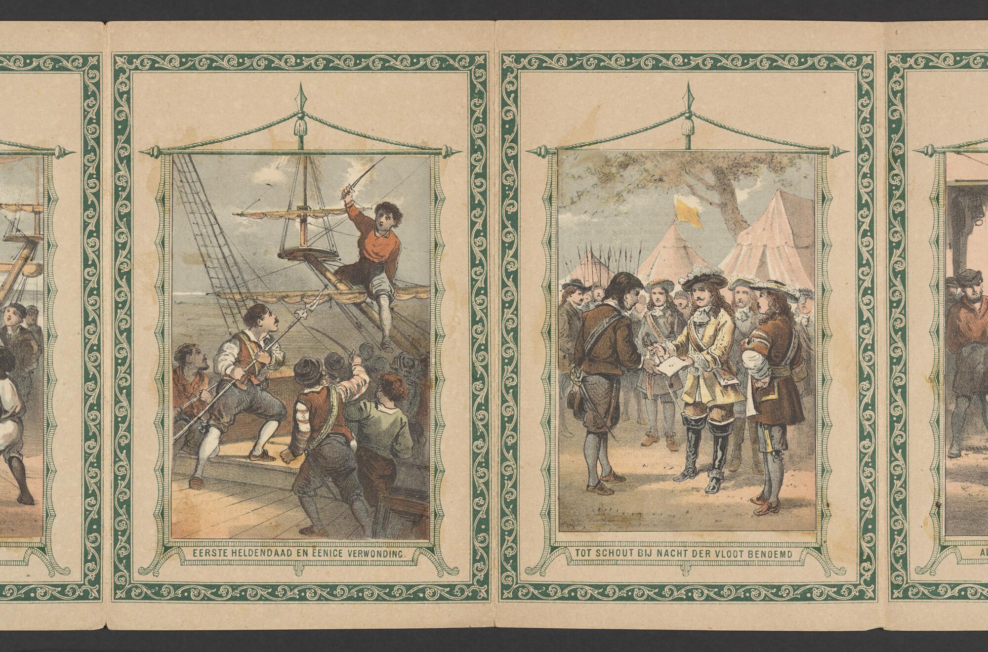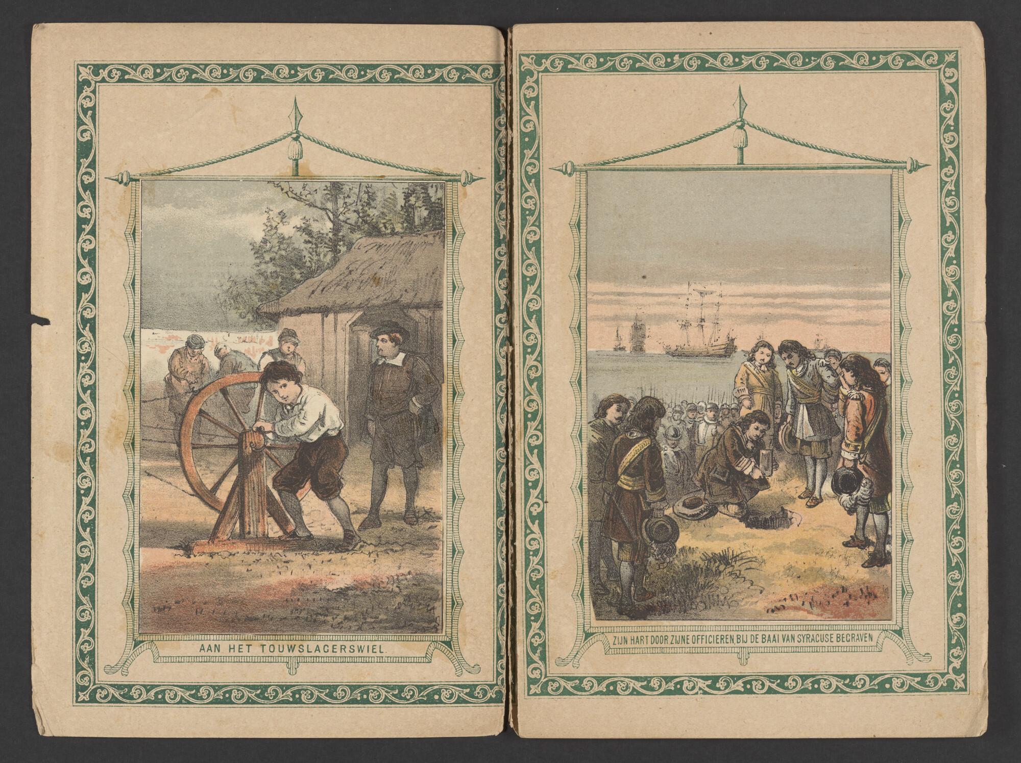 Boekje bestaande uit een rits van twaalf prenten met scènes uit het leven van Michiel de Ruyter. Uitgave van de Nieuwe Christelijke Scheurkalender, 1883.
