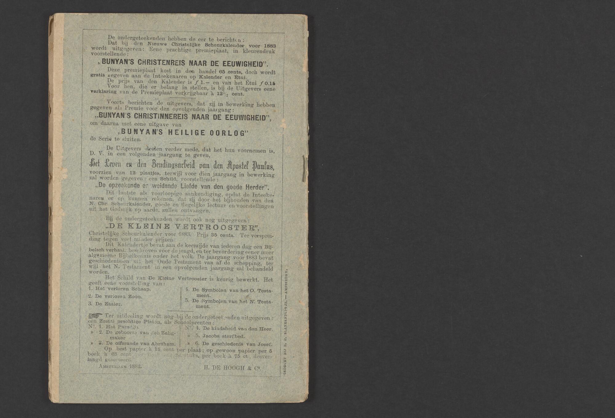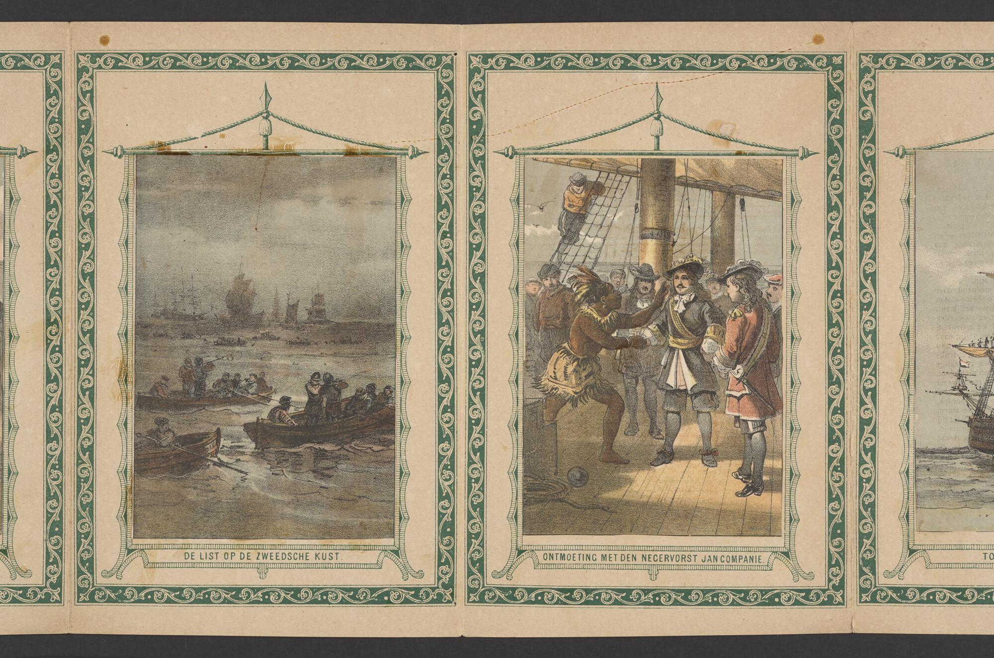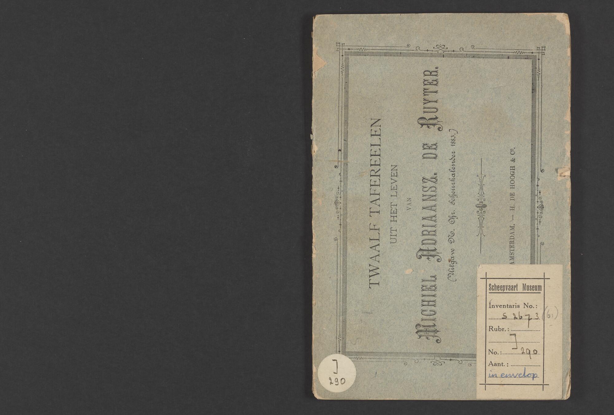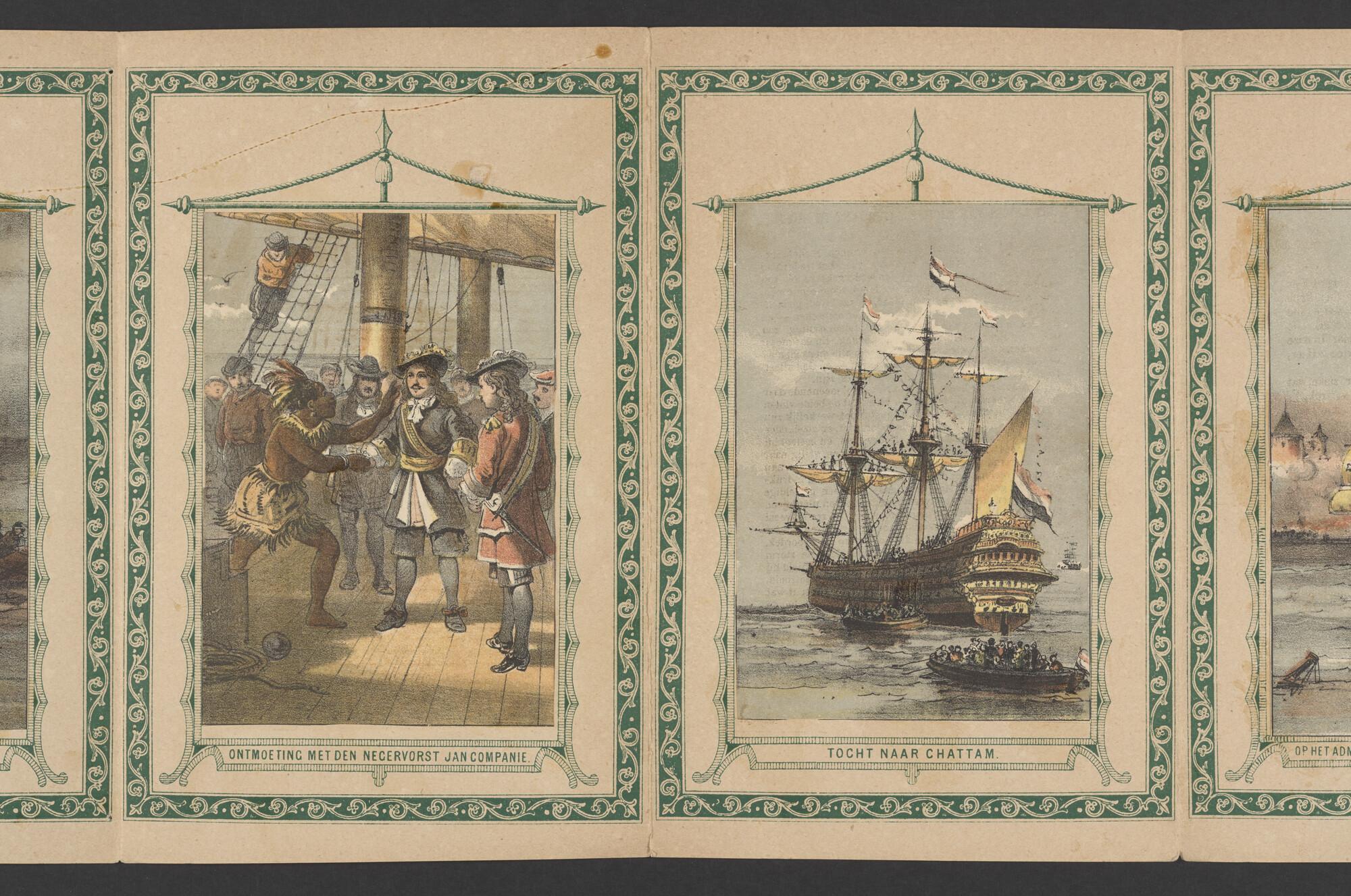 Boekje bestaande uit een rits van twaalf prenten met scènes uit het leven van Michiel de Ruyter. Uitgave van de Nieuwe Christelijke Scheurkalender, 1883.