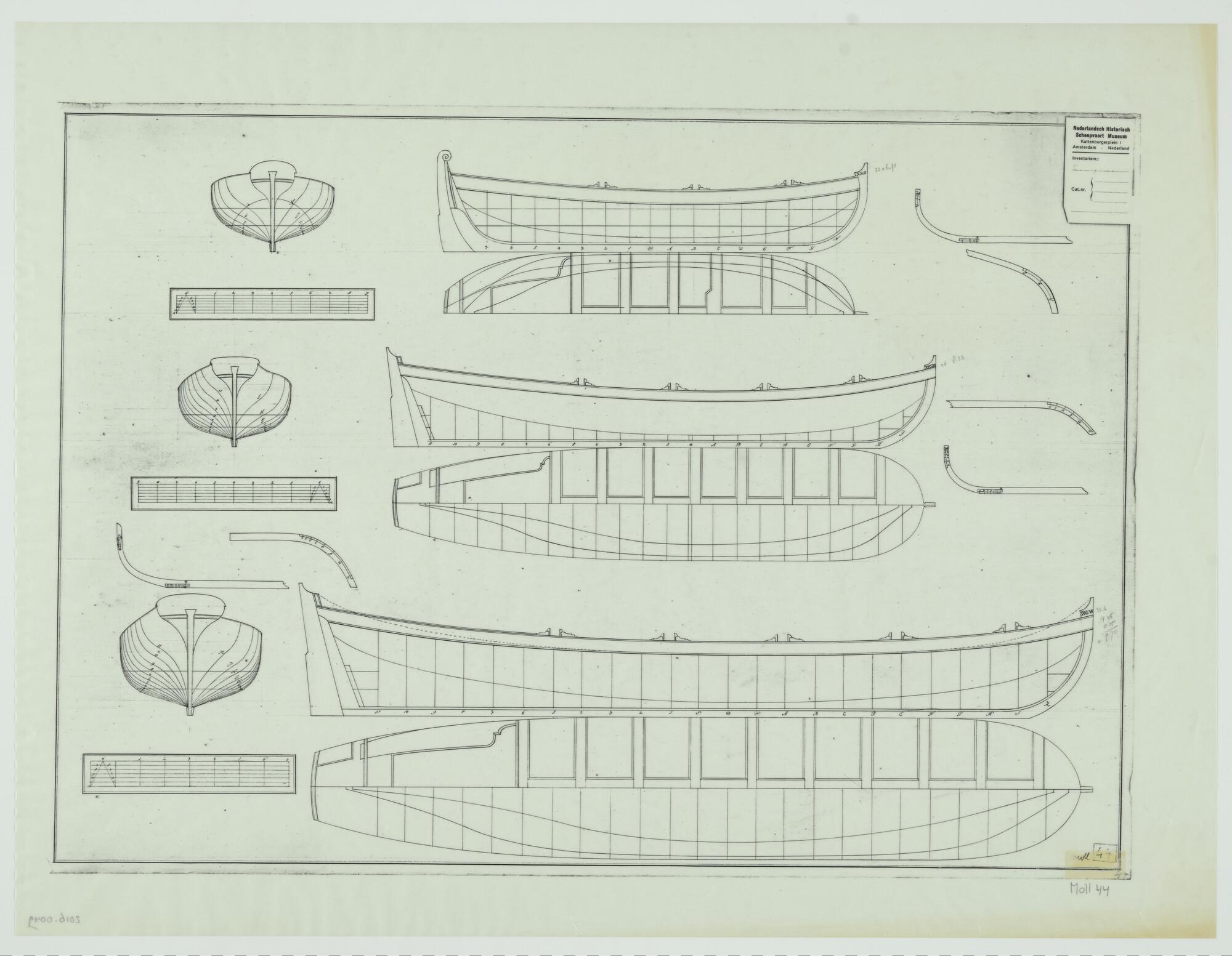 Half bovenaanzicht over BB-zijde en zijaanzicht met lijnen, spantenraam van een jol van zes riemen, lengte 6.71 m. Bovenaanzicht en zijaanzicht met lijnen, spantenraam van een sloep van acht riemen, lengte 8.53 m. Bovenaanzicht en zijaanzcht met lijnen, spantenraam van een sloep van tien riemen, lengte 9.70 m.