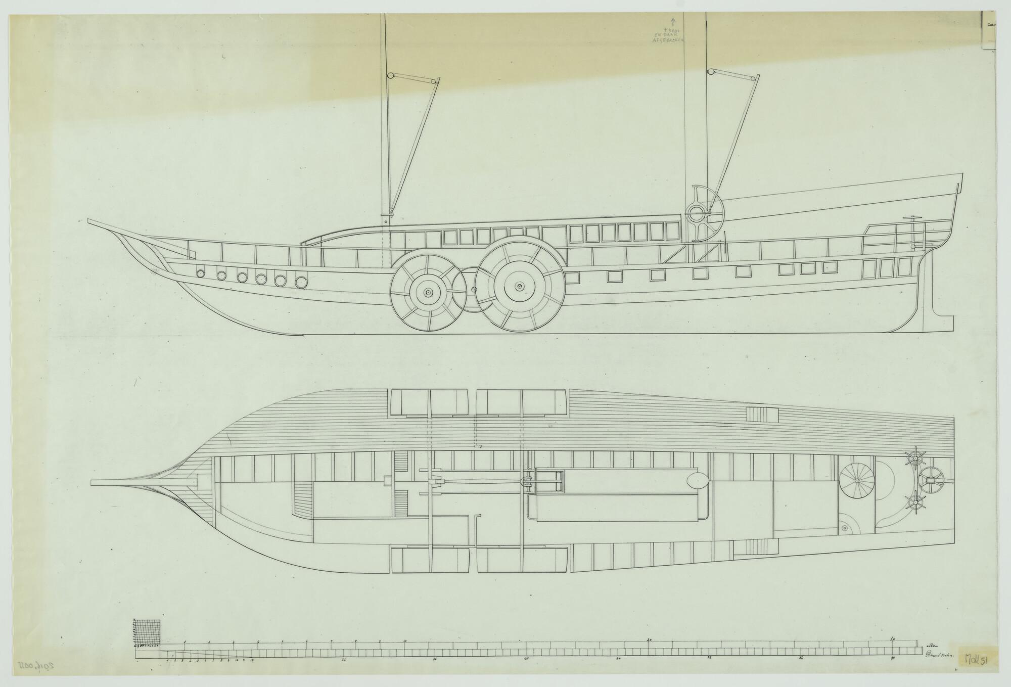 Zijaanzicht over bakboord en horizontale langsdoorsnede van een met dubbele zijraderen uitgeruste rader-rivierstoomboot (omstreeks 1823). Passagierssalon aan dek en benedendeks in het voorschip en in het achterschip. Achteruit een mik waarop de top van de afgevierde schoorsteen komt te rusten. Mast met giek. Afmetingen: 99 x 24.3 x 8.5 Rijnlandse voet.