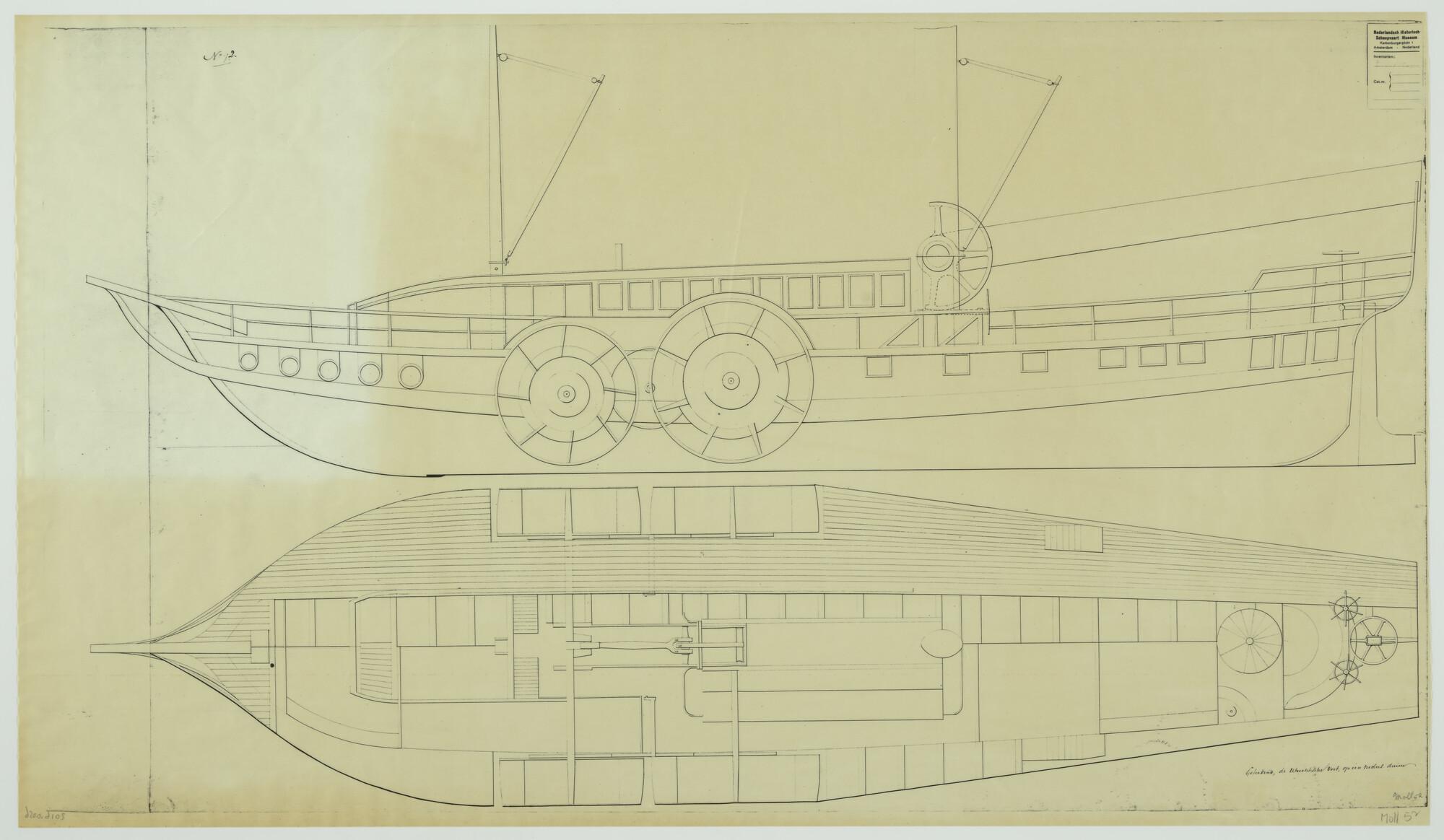 Zijaanzicht over bakboord en horizontale langsdoorsnede van een met dubbele zijraderen uitgeruste rader-rivierstoomboot (omstreeks 1823). Passagierssalon aan dek en benedendeks in het voorschip en in het achterschip. Achteruit een mik waarop de top van de afgevierde schoorsteen komt te rusten. Mast met giek. Afmetingen in Utrechtse voet op een Nederlandse duim.