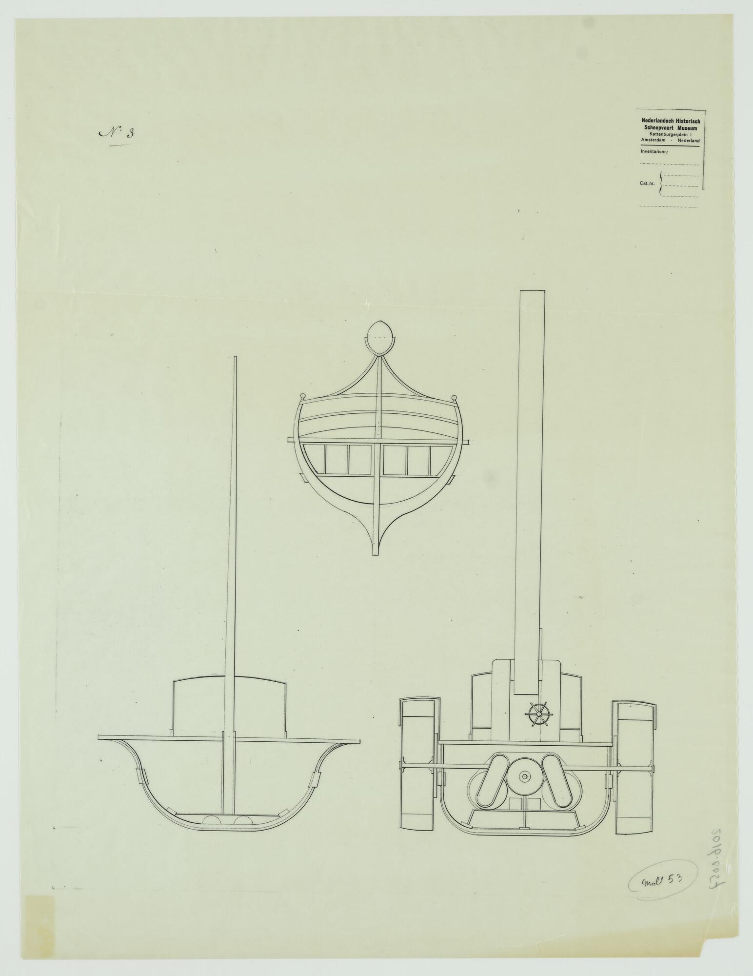 Drie dwarsdoorsnedes over een rader-rivierstoomboot (omstreeks 1823). Doorsnede over de mast, doorsnede over de hoge schoorsteen met stuurwiel, stoomketel en beide zijraderen, doorsnede over het achterschip met mik waarop de top van de afgevierde schoorsteen komt te rusten.