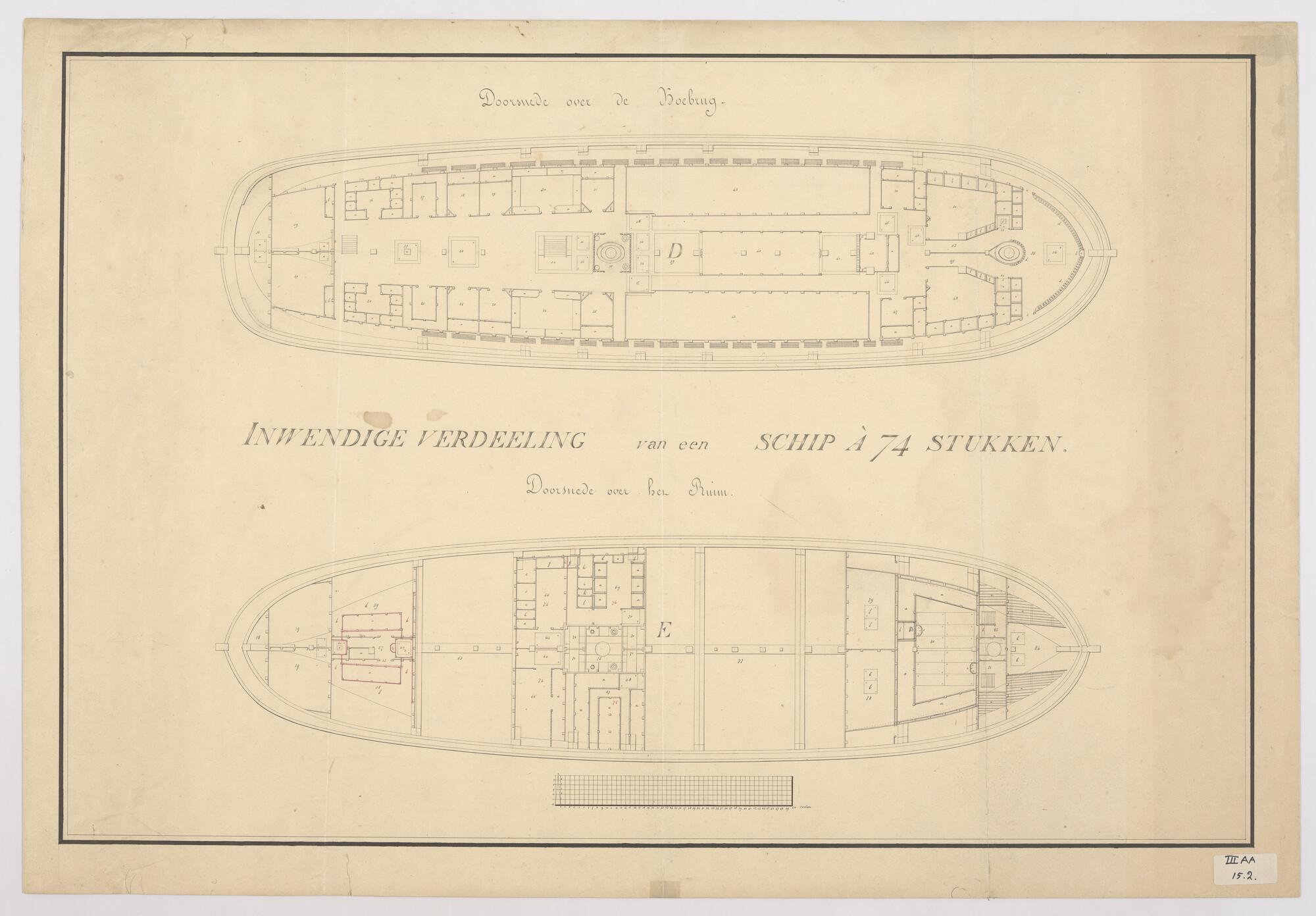 Verticale langsdoorsnede en bovenaanzicht tussendek, koebrugdek en ruim.van het linieschip 'Kortenaer'.