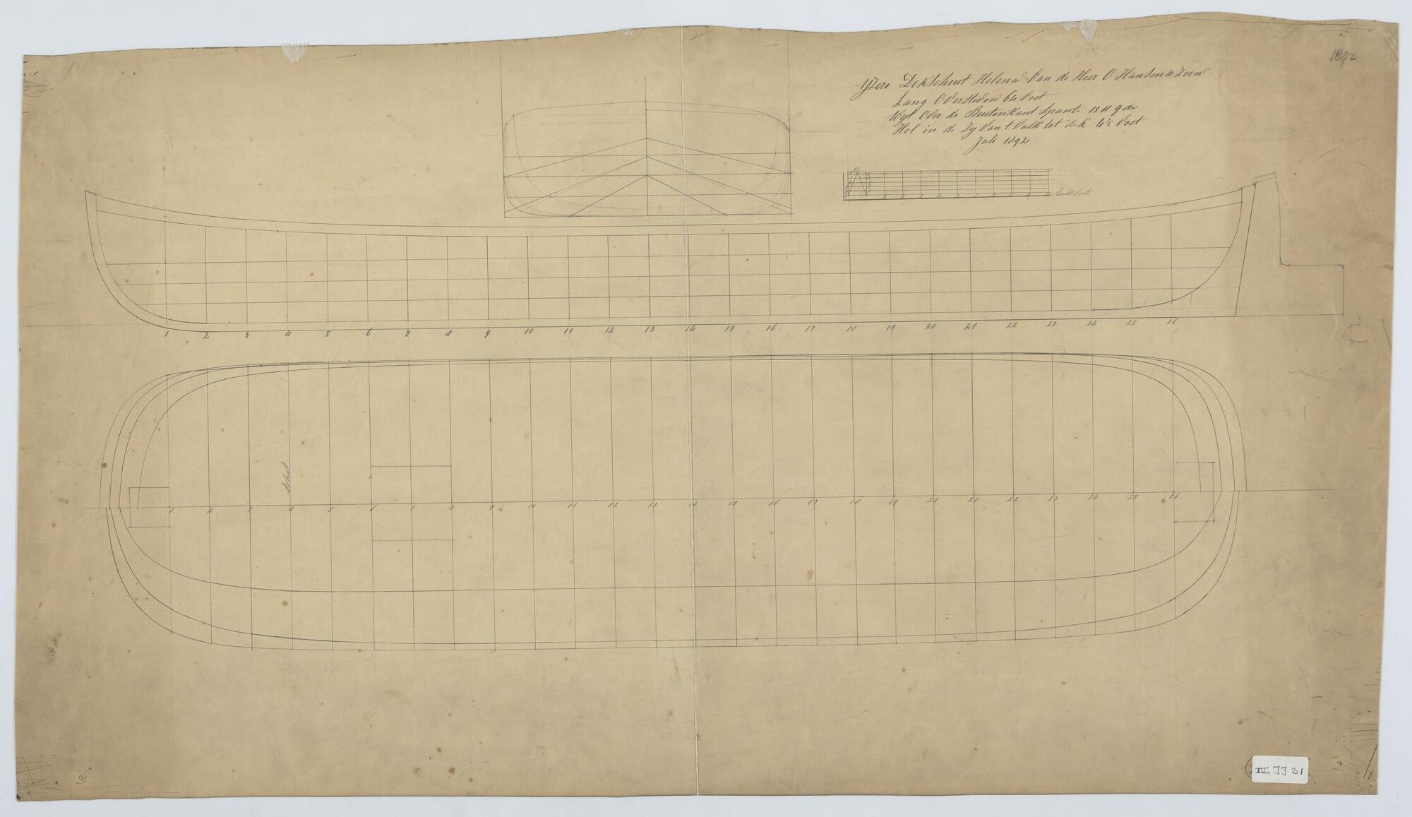 Lijnenplan, boven-, zij-, voor- en achteraanzicht van een ijzeren dekschuit, 1892.
