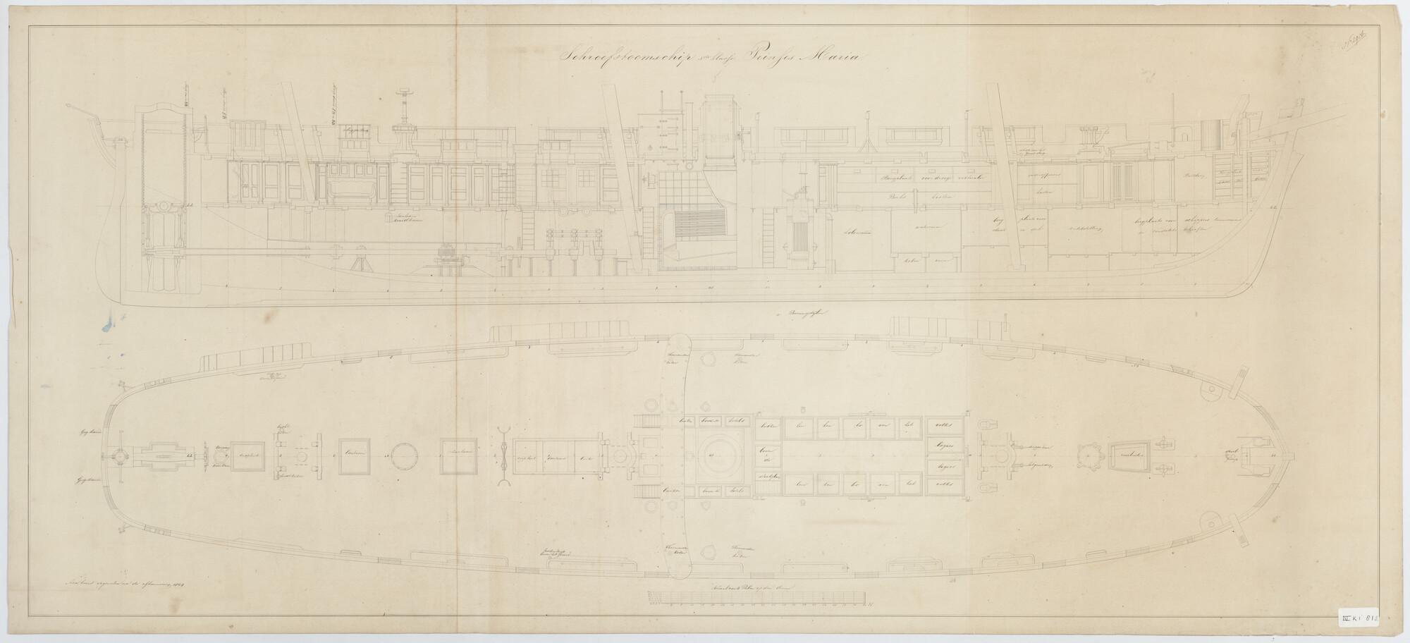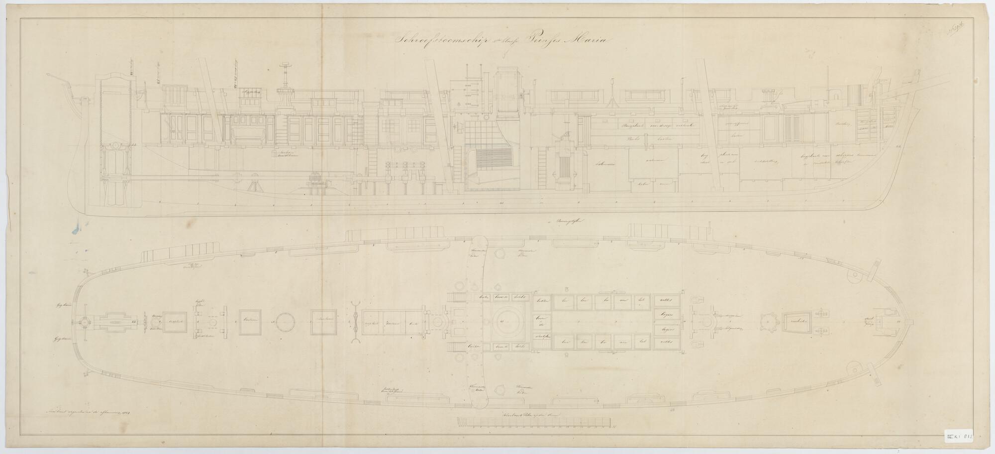Het schroefstoomschip 3de klasse Zr.Ms. "Prinses Maria", 1858. 46.68 x 9 x 4.80 ellen. verticale langsdoorsnede, Bovendek. (2 tekeningen).