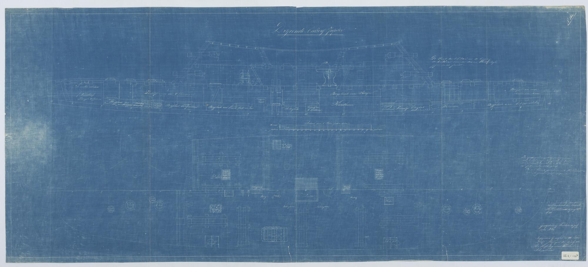 Drijvende batterij "Jupiter", 1859 (ex- Zr.Ms. "Zeeuw"). Verticale langsdoorsnede en horizontale langsdoorsnede.