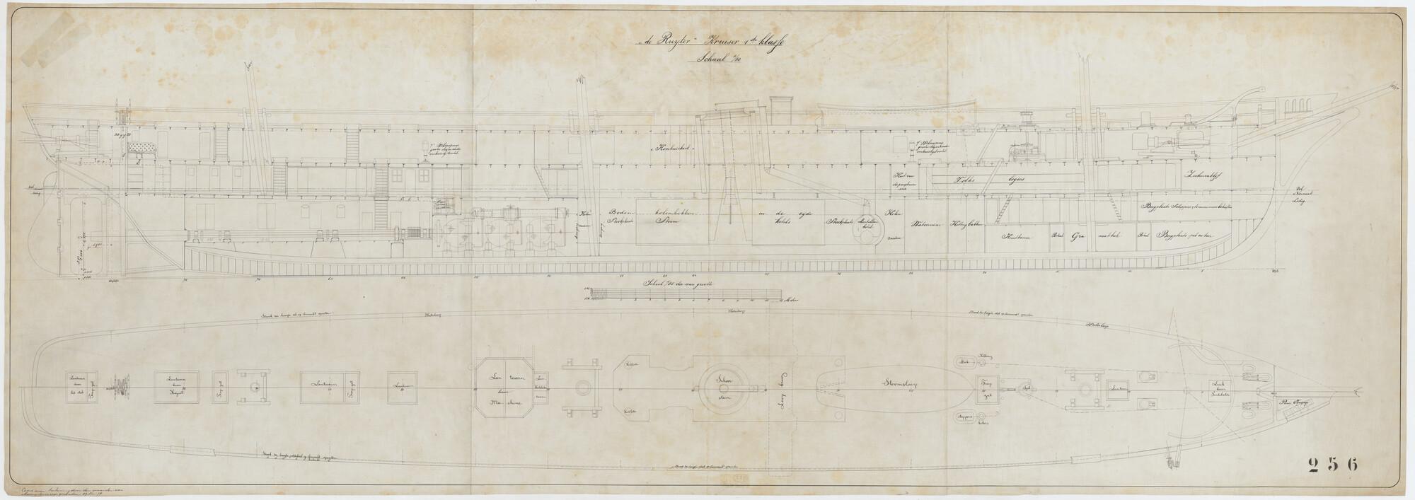 Het schroefstoomschip 1ste klasse Zr.Ms. "De Ruyter", 1879. verticale langsdoorsnede en bovenaanzicht.