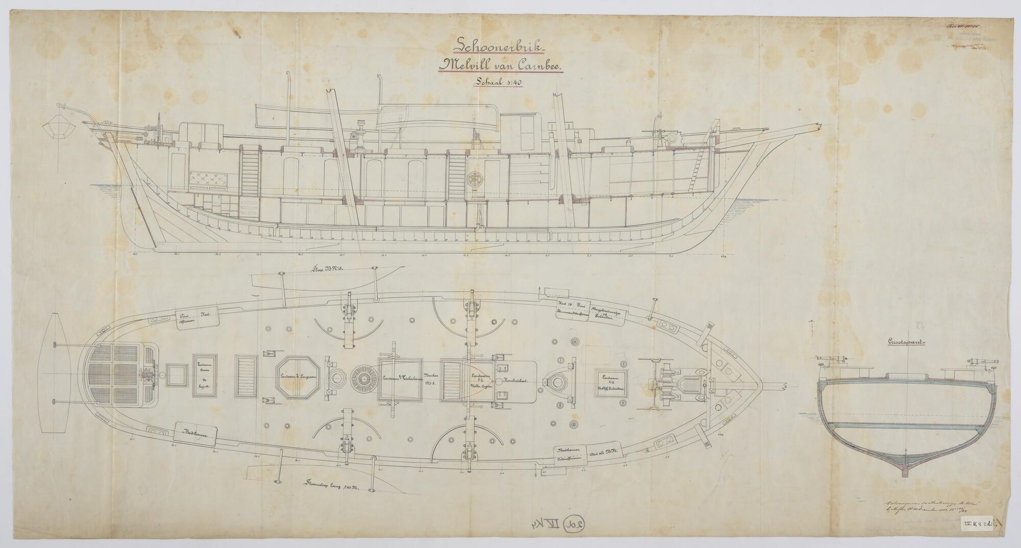 De schoenerbrikken Zr.Ms. "Melvill van Carnbee" en "Blommendal" 1881. verticale langsdoorsnede, bovenaanzicht, grootspant.