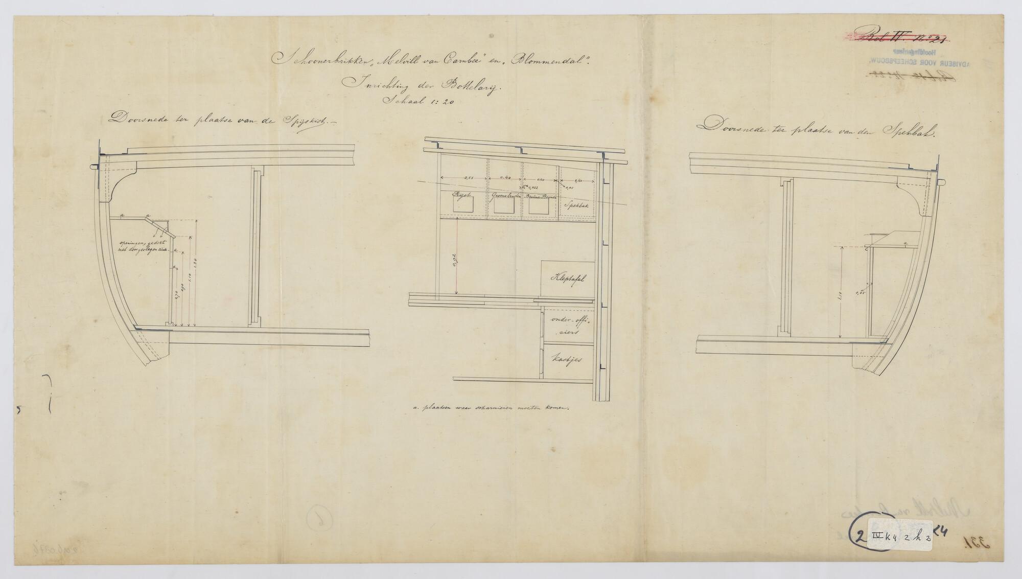 De schoenerbrikken Zr.Ms. "Melvill van Carnbee" en "Blommendal" 1881. Kooien bergplaats Europeanen, sloepdavits, kraanbalk, inrichting van enkele bergplaatsen.