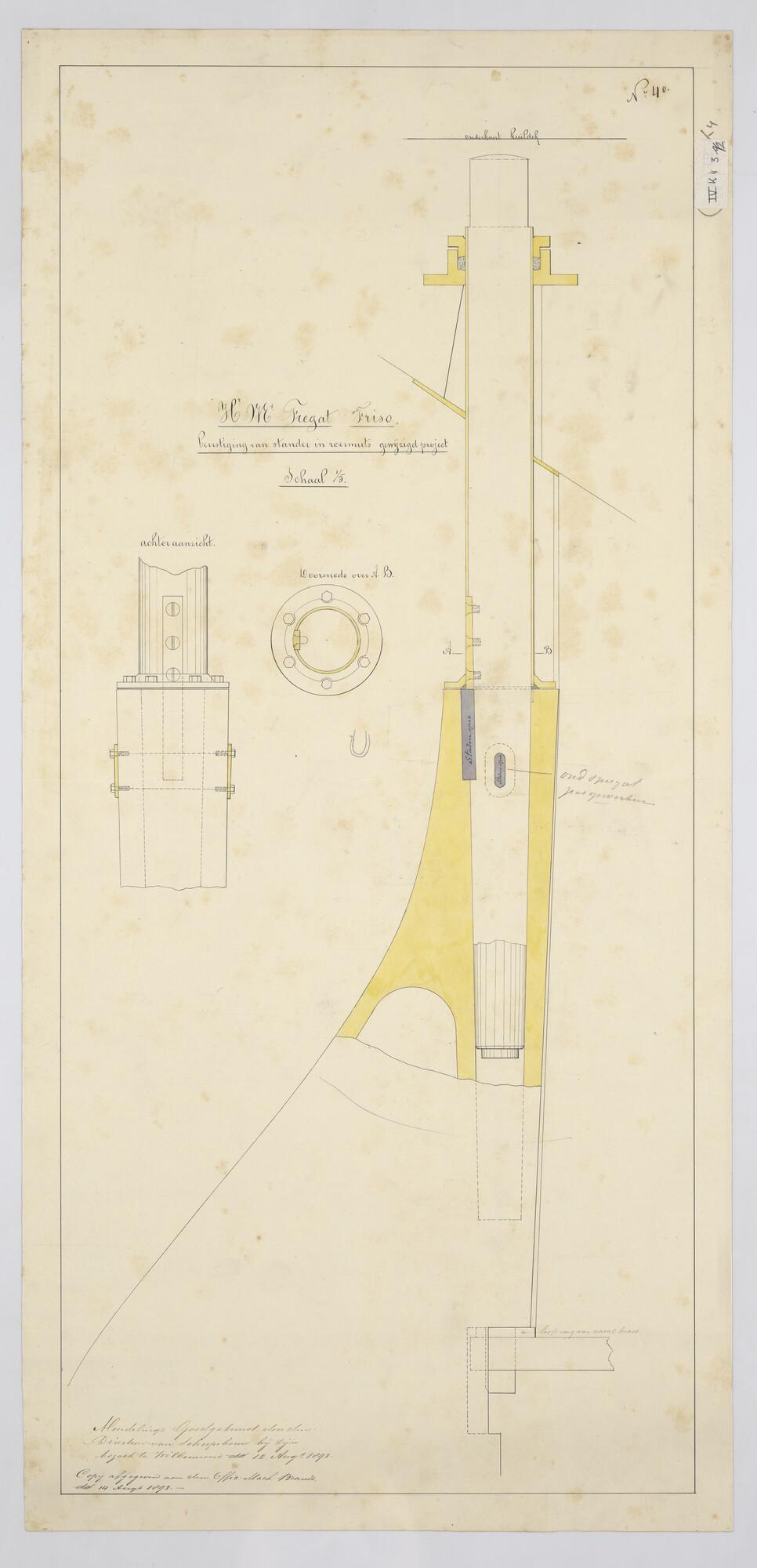 Het schroefstoomschip 1ste klasse Zr.Ms. "Johan Willem Friso", 1883. Bestaande bevestiging staander in roermuts. En wijziging.