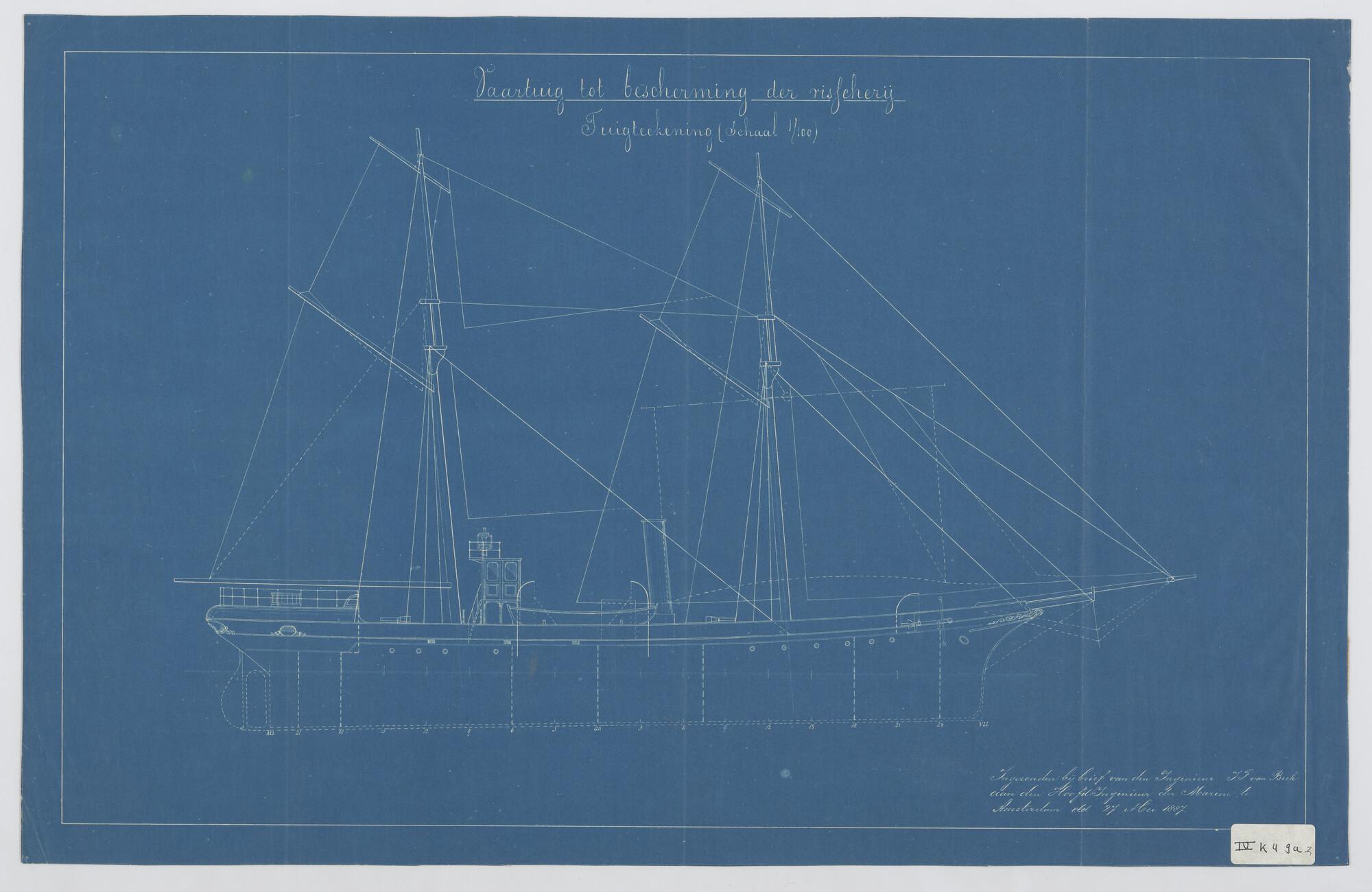 Schroefstoomschip politiekruiser Zr.Ms. "Dolfijn", 1888. Zijaanzicht met tuigtekening oud en nieuw.