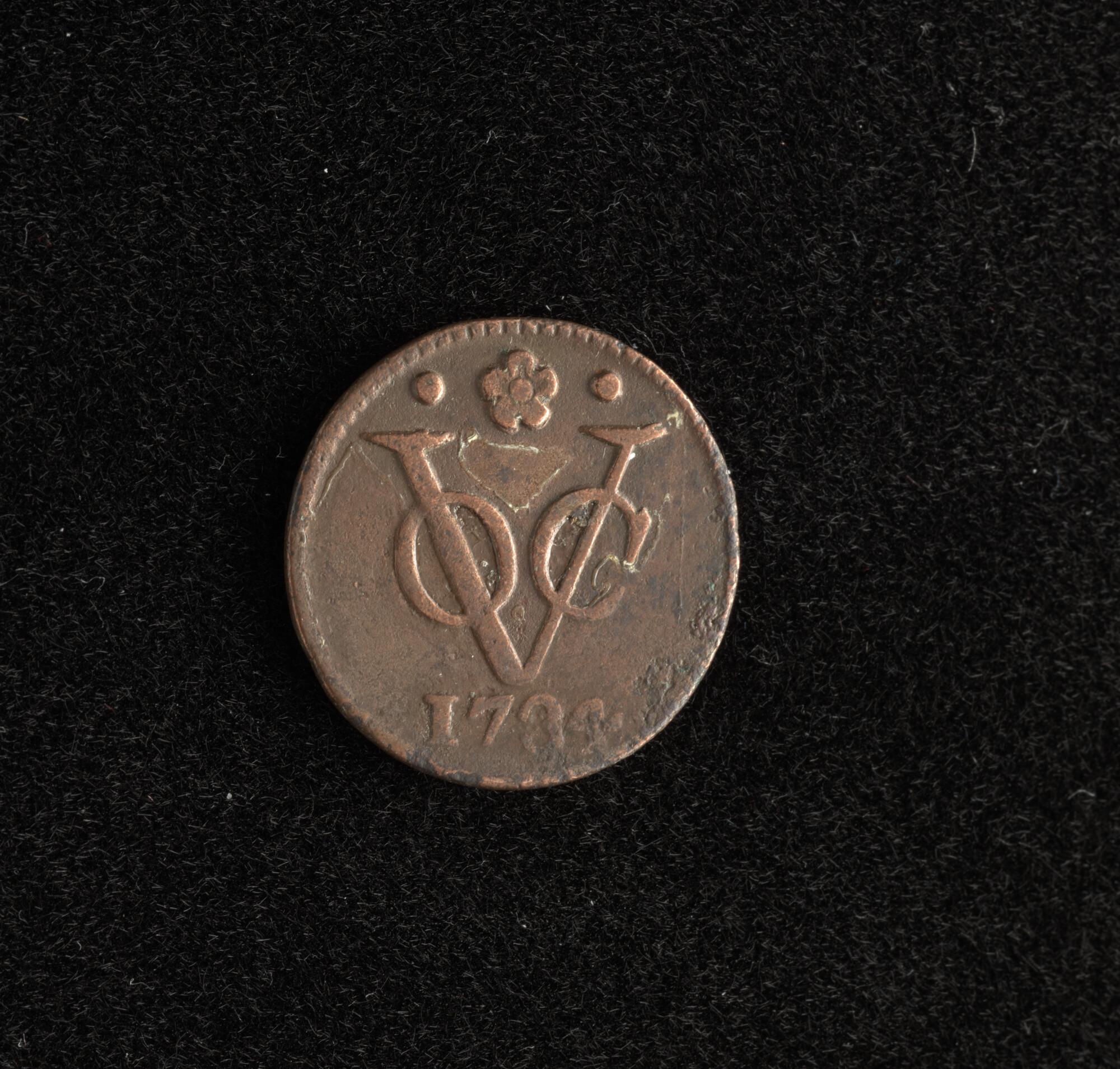 Een duit, geslagen te Holland voor de VOC, 1734.