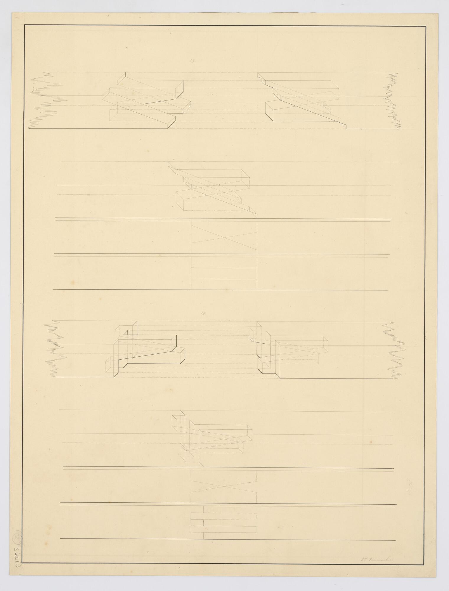 Constructietekening van een houten reling, detail.
