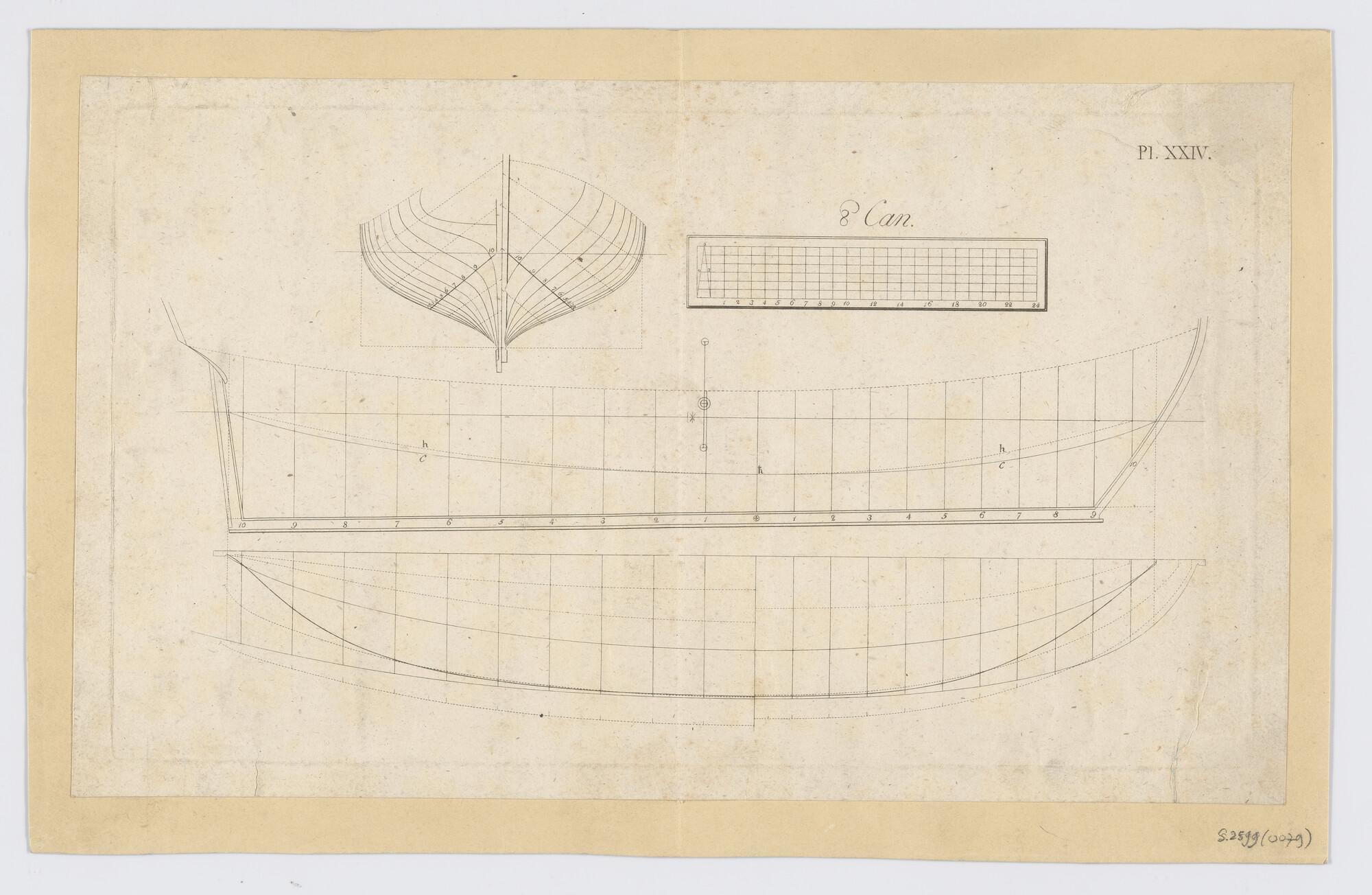 Lijnenplan van een oorlogsschip van 8 stukken.