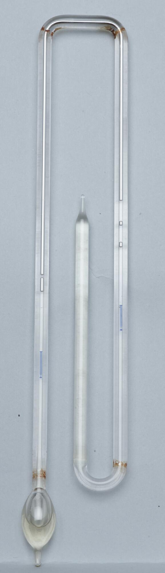 Minimum- maximum kwik thermometer waar van het plankje met schaalverdeling ontbreekt. Onderdeel uit de medicijnkist van de Nederlandse Noordpool Expeditie 1882 - 1883.
