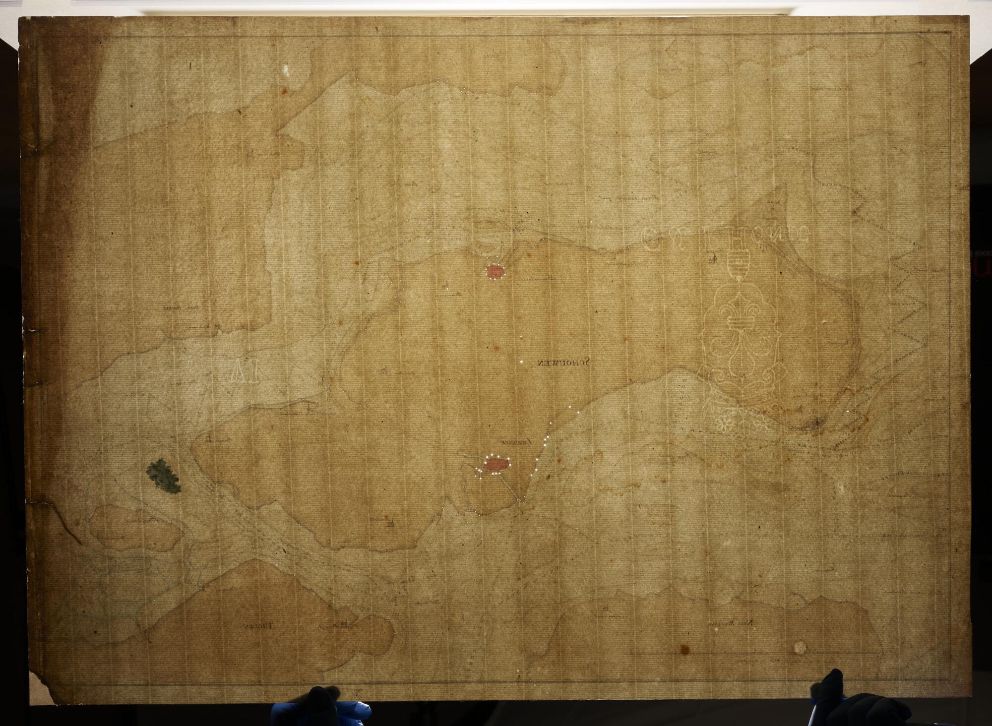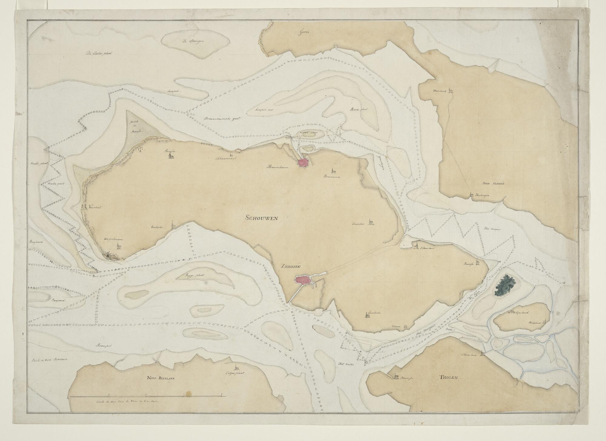 Zeekaart in handschrift van de zeegaten rond het eiland Schouwen-Duiveland met delen van Goeree, Noord-Beveland en Tholen, met de zandbanken en dieptecijfers