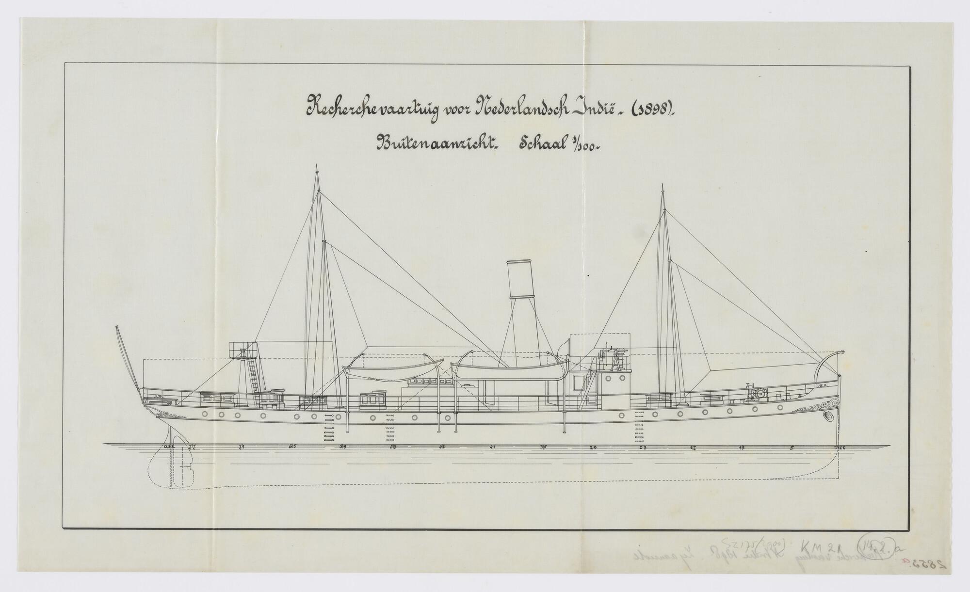 Zijaanzicht over stuurboordzijde van de stoomschepen voor de gouvernementsmarine Hr.Ms. Brak, Hazewind, Dog, Spits en Snip (recherchevaartuigen voor Nederlands-Indië - gewest Atjeh) (schaal 1:100).