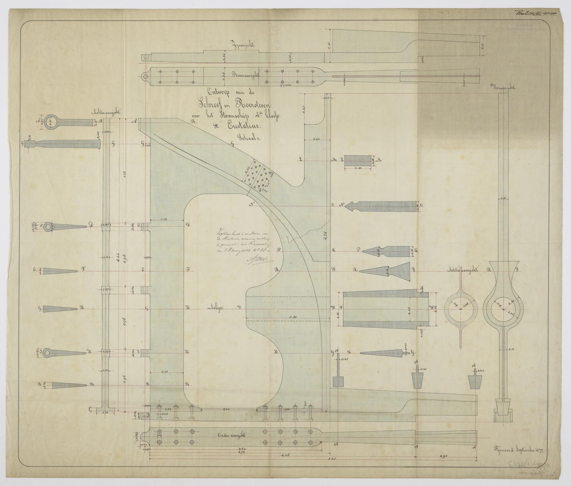 Langsdoorsnede van de schroef- en roersteven van het schroefstoomschip der vierde klasse Zr.Ms. "St.Eustatius" (Bali). Diverse doorsneden en aanzichten van details. Schroefasleiding (gedeelte).