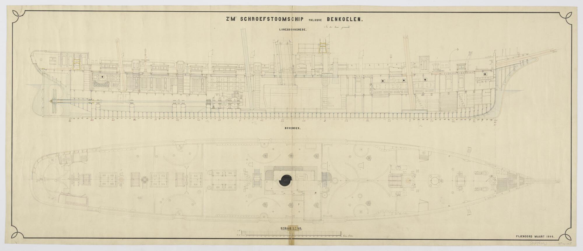 Langsscheepse doorsnede en indelingstekening van het bovendek van het schroefstoomschip der vierde klasse Zr.Ms. Benkoelen