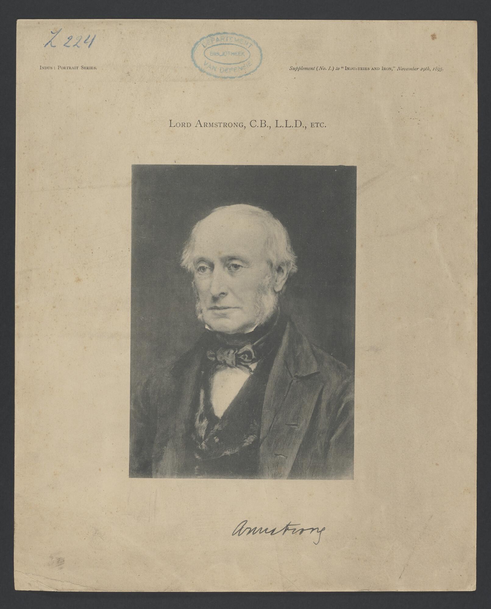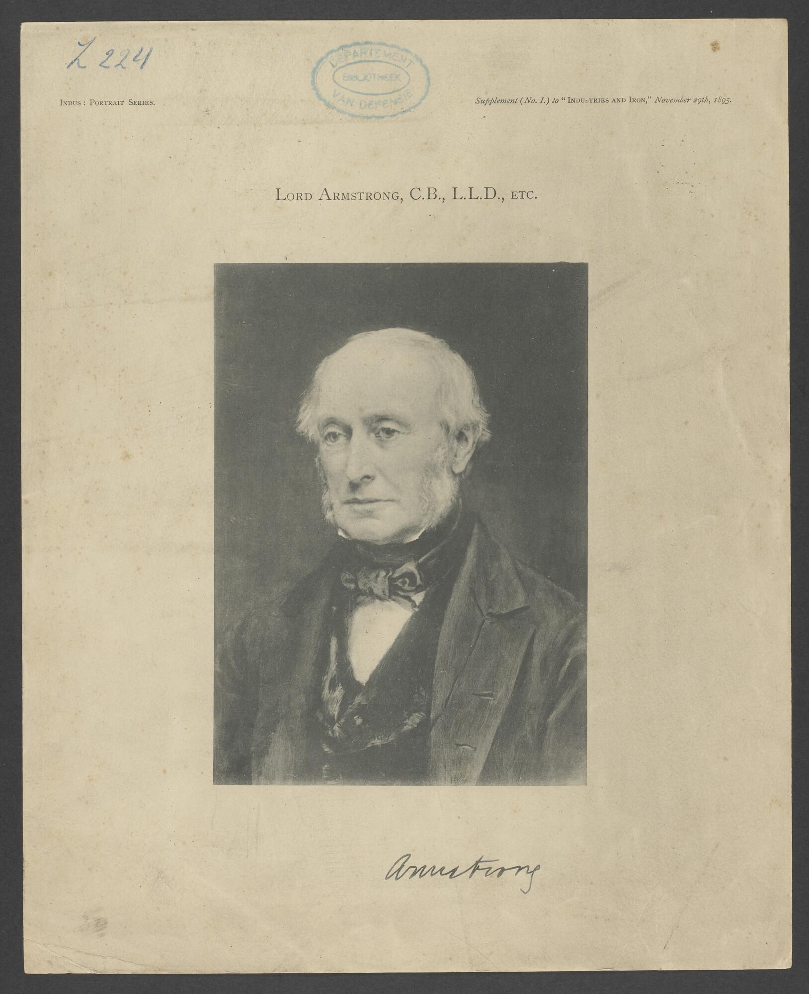 Prent, portret van William George Armstrong, first Baron Armstrong of Cragside (1810-1900). Supplement no. 1 bij de publicatie "Industries and Iron", uitgave 29 november 1895.
