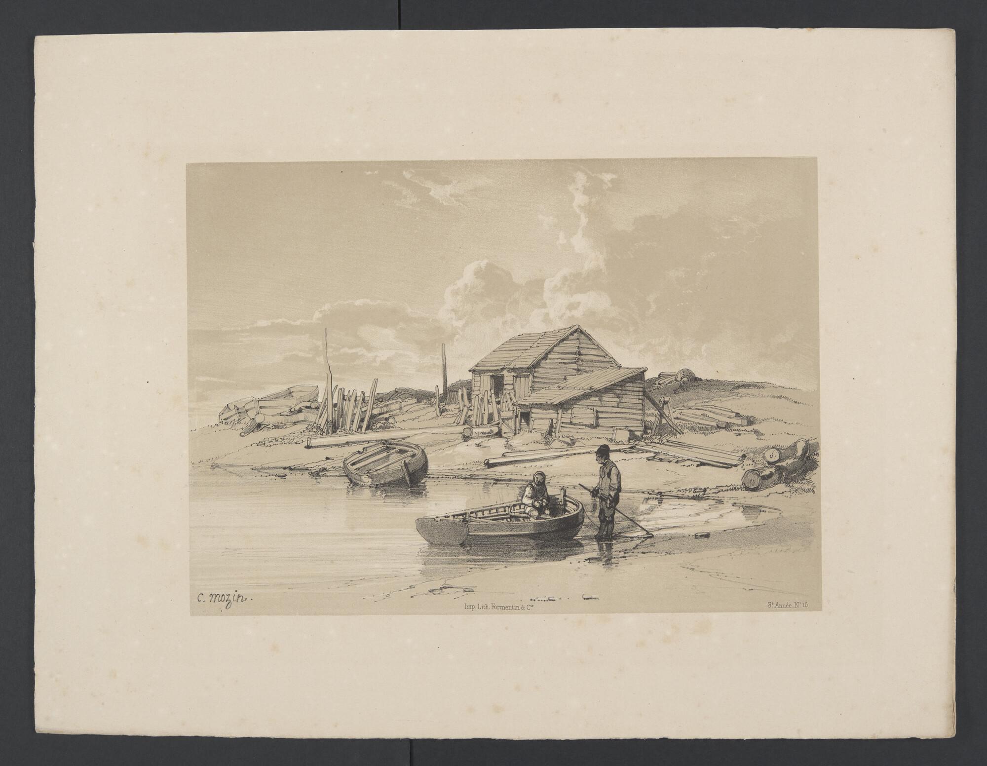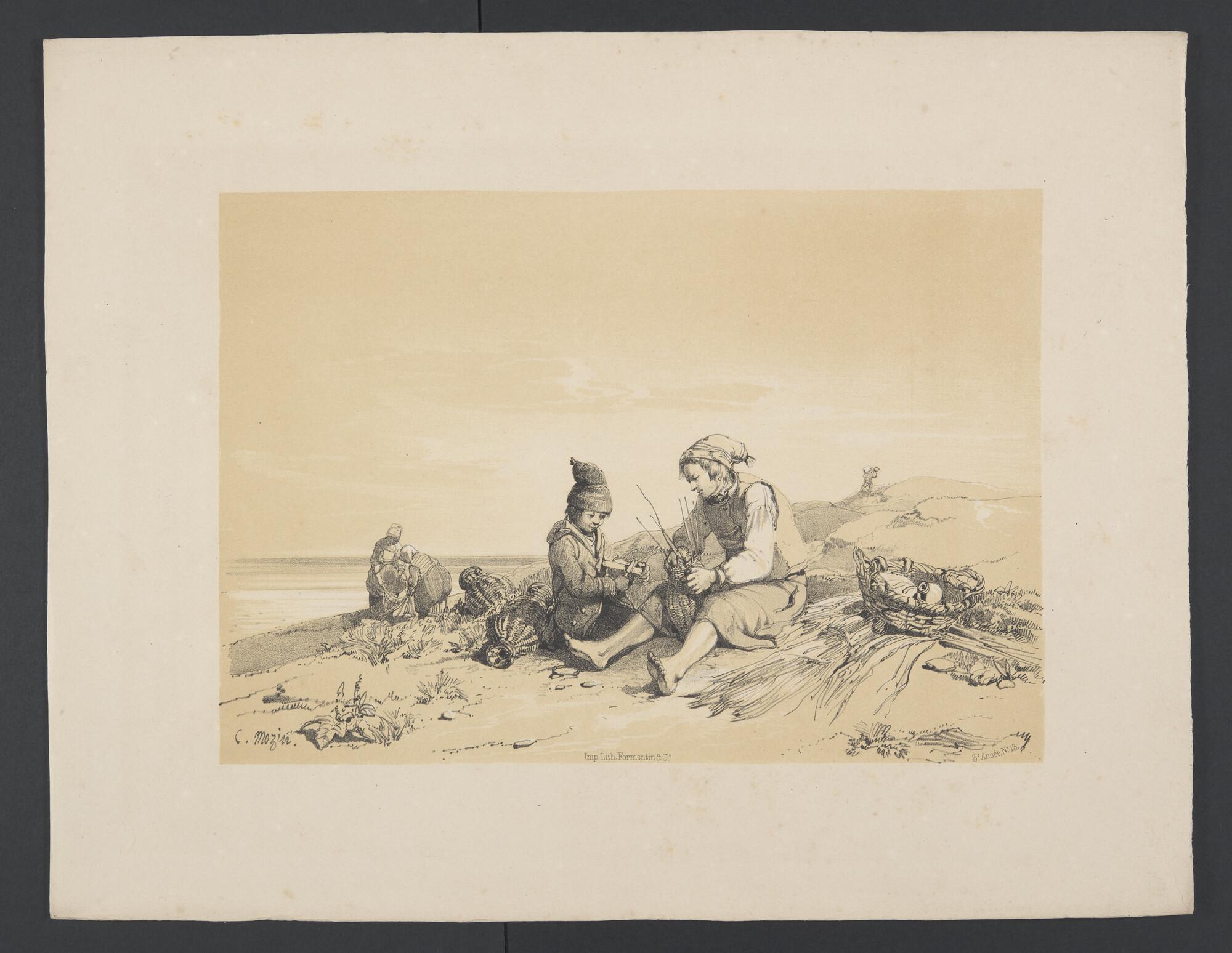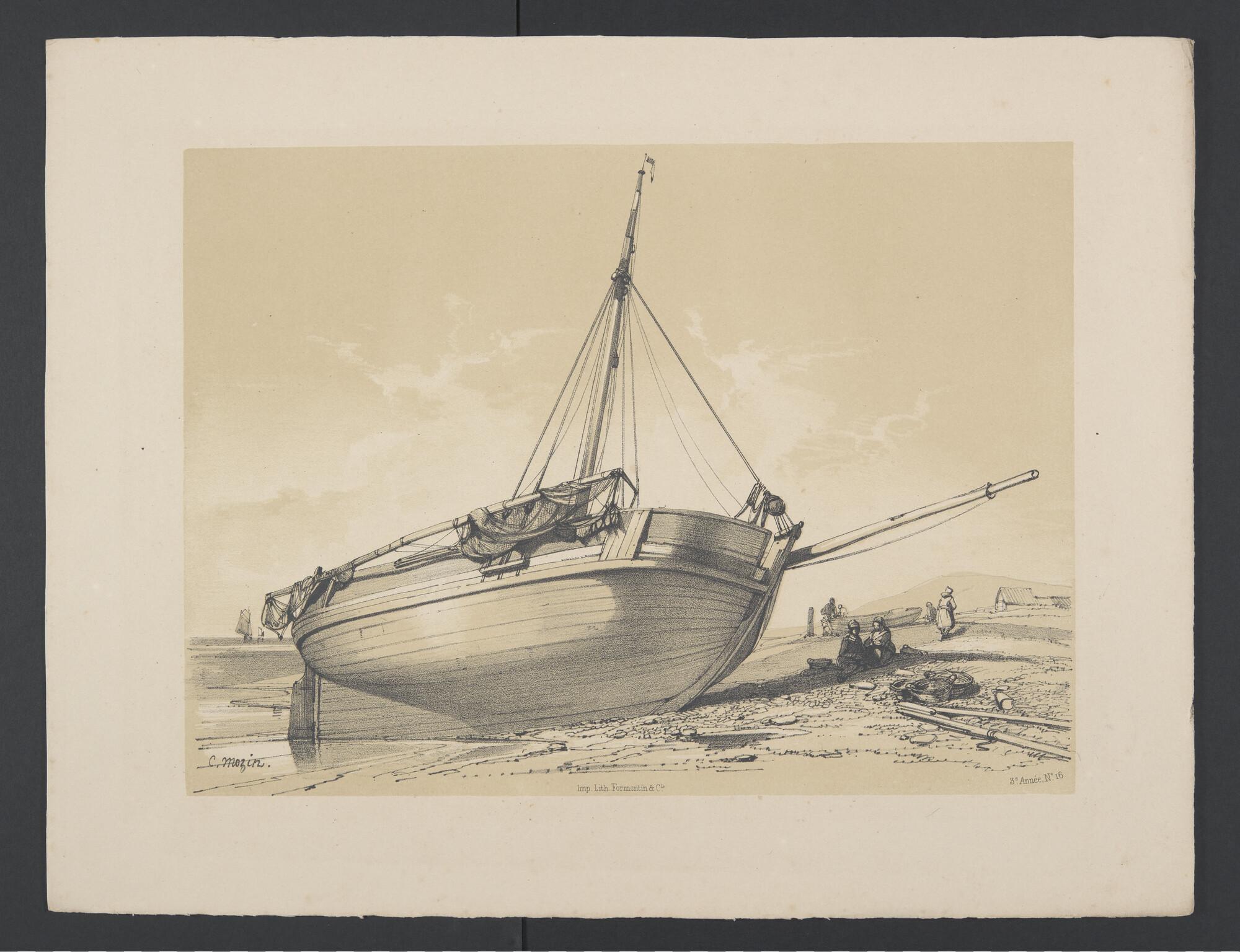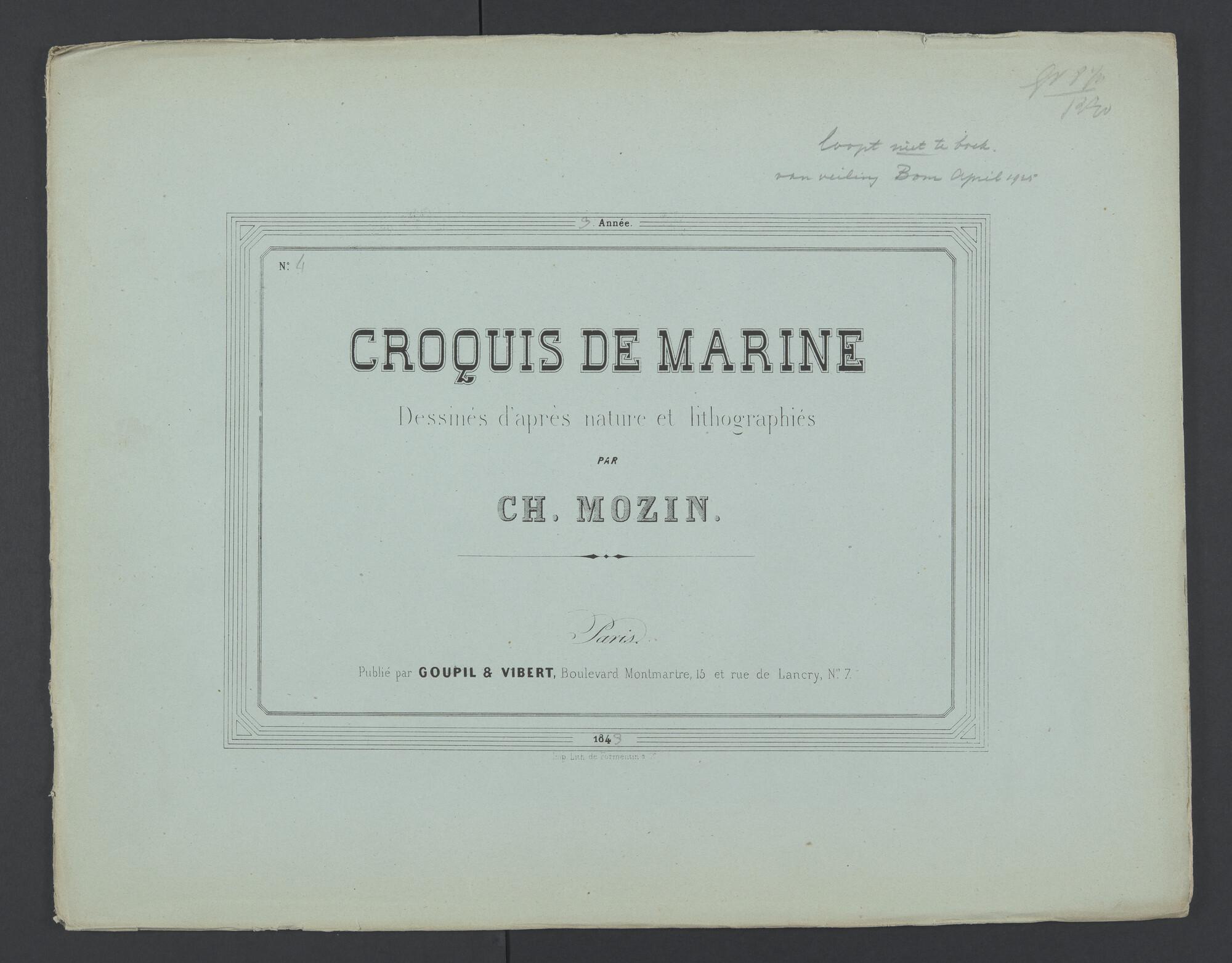 Prentenboek (incompleet) met drie van de oorspr. vier losse prenten door Charles Louis Mozin; voorstellingen van strand-, haven- en andere maritieme scenes rondom diverse scheepstypen, voornamelijk kleine vissersschepen en sloepen. Deel 4 uit de 3e jaargang van "Croquis de Marine, Dessinés d'après nature et lithographiés".