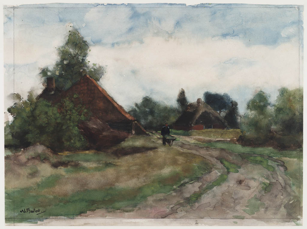 Landweggetje langs boederijen met een man met kruiwagen