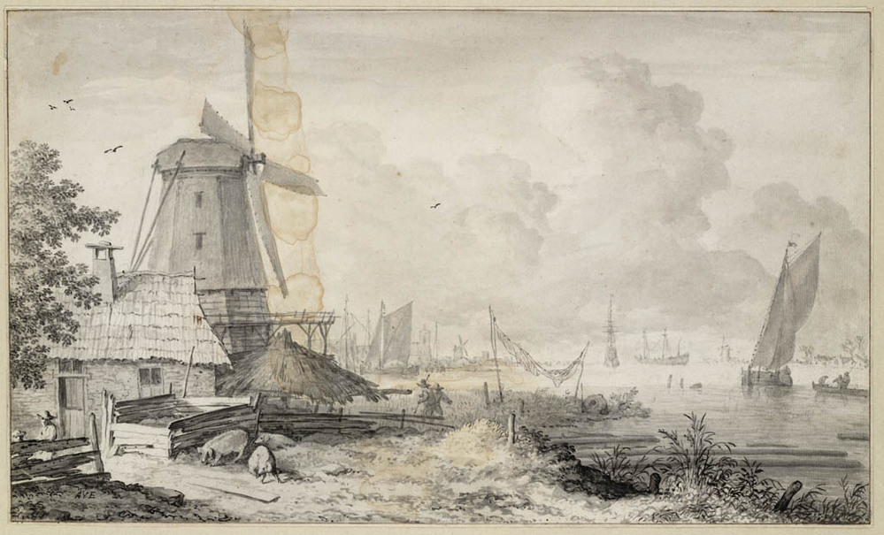 Boomrijk berglandschap met een man en een bij een beek met waterval.