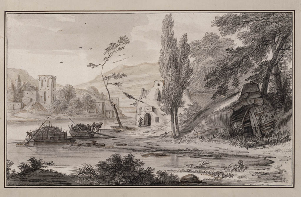 Bergachtig landschap met rivier, waarop twee vaartuigjes, beladen met hout drijven, l. en r. gebouwen