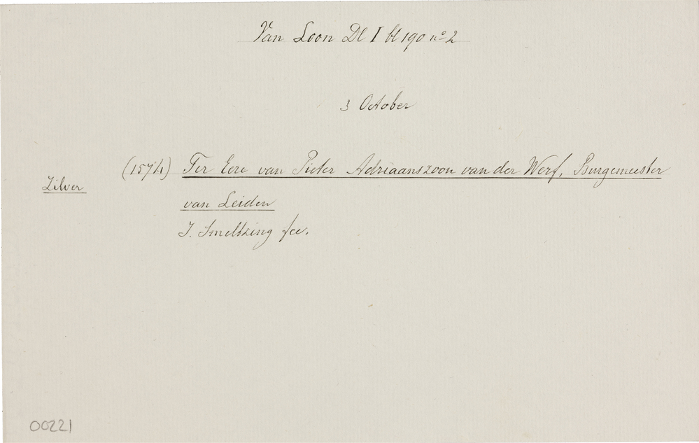 keerzijde: palm- en eikentak en slangerond boven opschrift, onderaan stadsgezicht van Leiden, onder de tekst is vaag het gedicht van de penning Van Loon-1H 190-1 zichtbaar