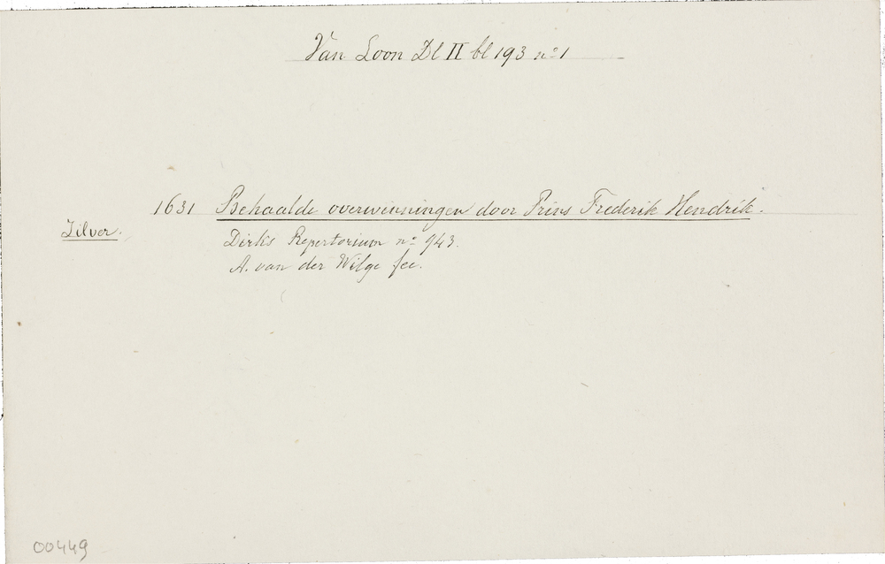 keerzijde: ‘heer’ in de wolken, twee engelen met bazuinen houden lauwerkrans boven gekroond wapen tussen twee figuren, daaronder een overzicht van Frederik’s overwinningen (inname van ’s-Hertogenbosch, Grol en Wesel; verovering van de Zilvervloot door admiraal Piet Hein; Pernambuco ingenomen door admiraal Lonck en generaal Waardenburg)