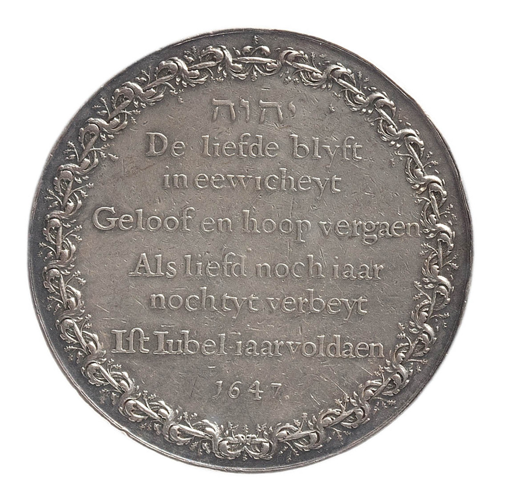 keerzijde: ‘heer’ in Hebreeuws en opschrift, omlijst met bladranken