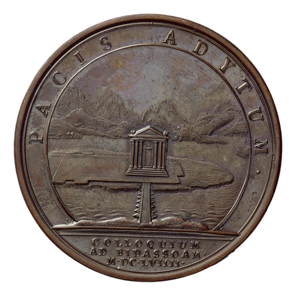 keerzijde: Eiland in de rivier de Bidassoa; daarop klassieke tempel. Op de achtergrond bergen.