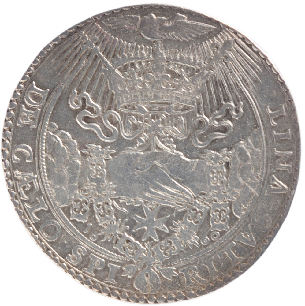 keerzijde: Duif in stralenkrans. Daaronder een kroon met twee gekruiste scepters, twee ineengeslagen handen omhangen met de orde van het Gulden Vlies en een Maltezer kruis.