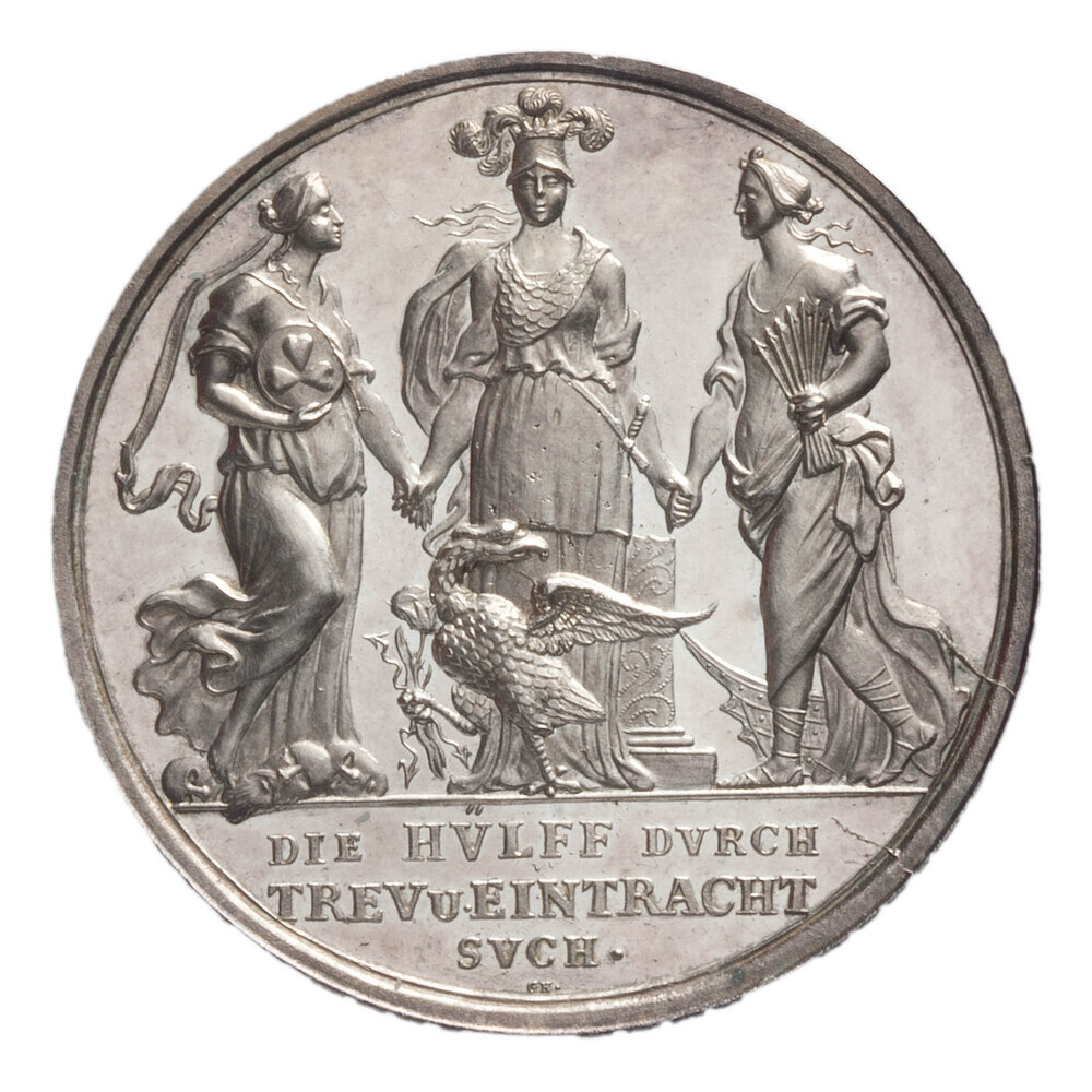 keerzijde: drie vrouwen staan hand in hand. Linker vrouw draagt schild met daarop drie harten; de rechter heeft in de linkerhand pijlenbundel. Voor de vrouwen staat een arend. Op de grond drie maskers
