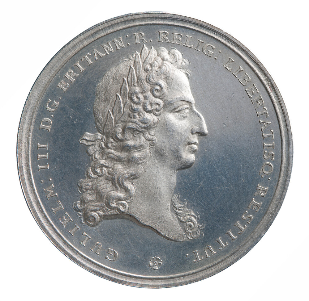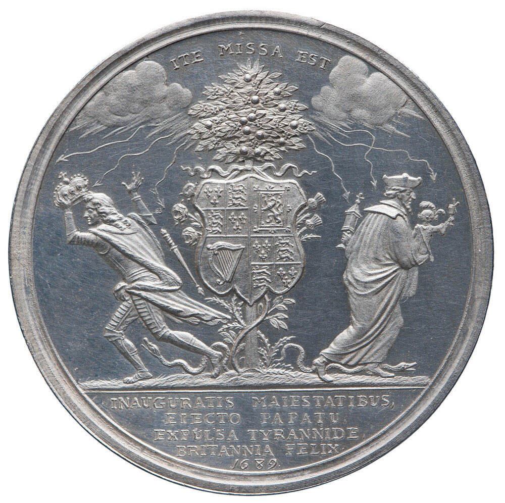 keerzijde: aan oranjeboom hangt het Britse wapenschild. Uit de lucht komen bliksemstralen. Links laat man kroon en scepter vallen en slaat op de vlucht. Rechts vlucht Jezuïet met een kind (met molentje) De tekst boven de boom, ITE MISSA EST, is de zin waarmee in de katholieke kerk wordt aangekondigd dat de mis ten einde ...