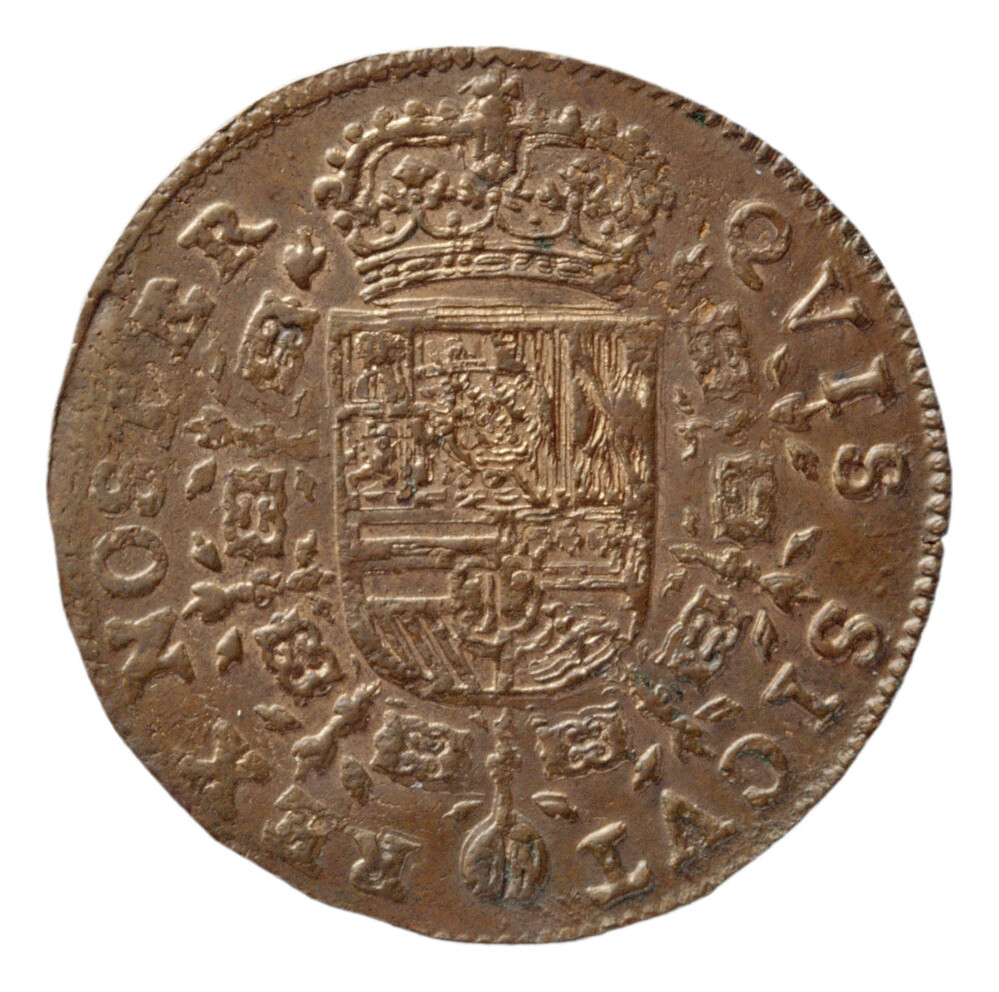 keerzijde: wapenschild gedeeld gekroond, boven Spanje (Castilla, Leon, Aragon, Sicilië, Granada), hartschild Portugal, onder gevierendeeld, 1 Oostenrijk, 2 Bourgondië-modern, 3 Bourgondië-oud, 4 Brabant, hartschild gedeeld Vlaanderen-Tirol omhangen met vliesketen