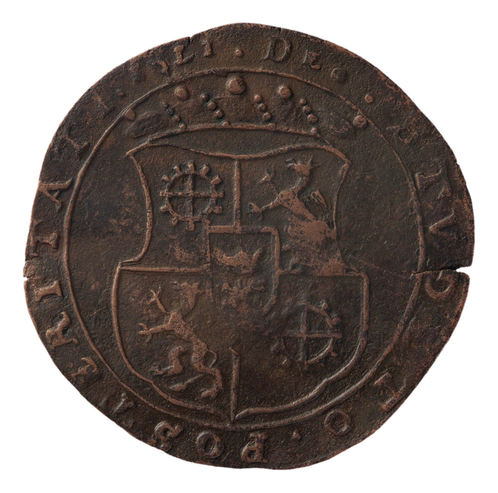 keerzijde: (familie)wapenschild Meyster gevierendeeld gekroond, 1-4 rad, 2-3 leeuw, hartschild