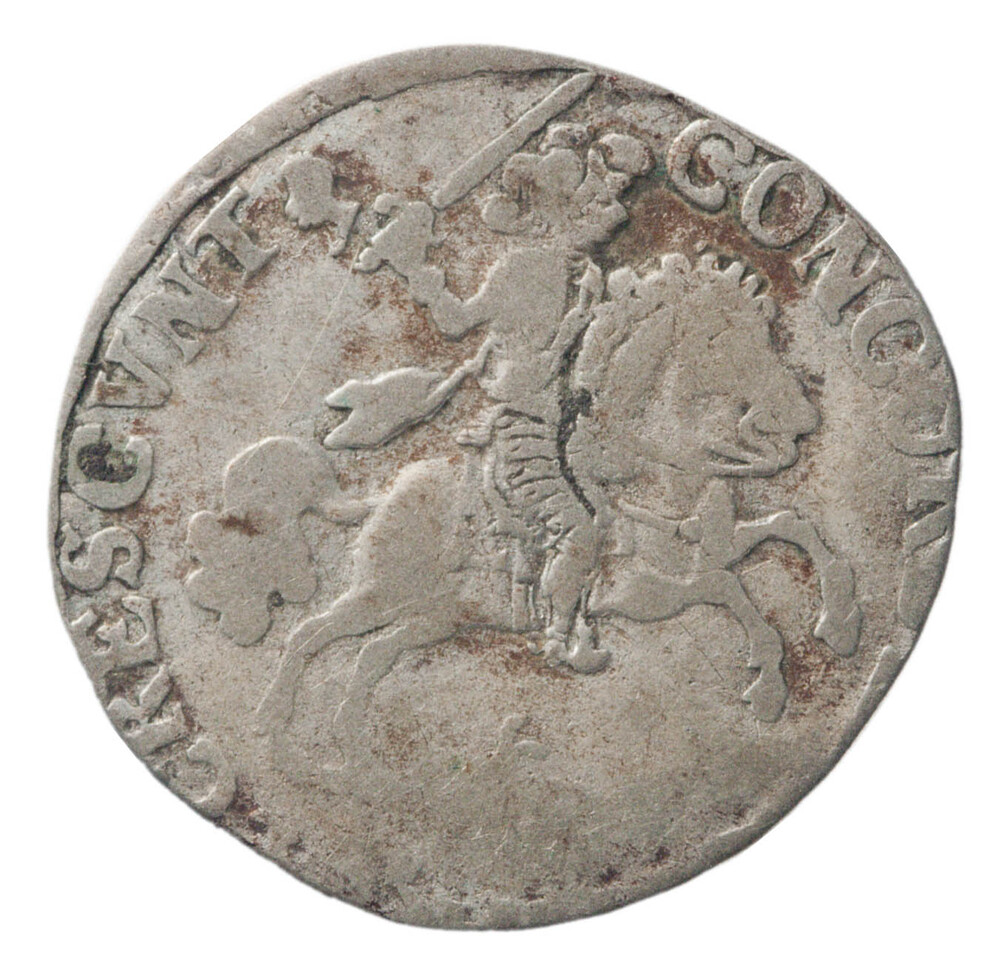 keerzijde: Geharnaste ruiter op opspringend paard met zwaard in de opgeheven rechterhand.