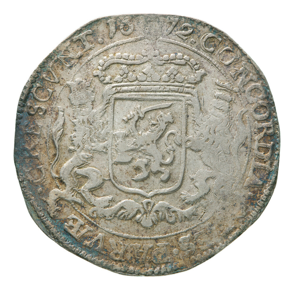 keerzijde: gekroond generaliteitswapen met twee leeuwen als schildhouders.
