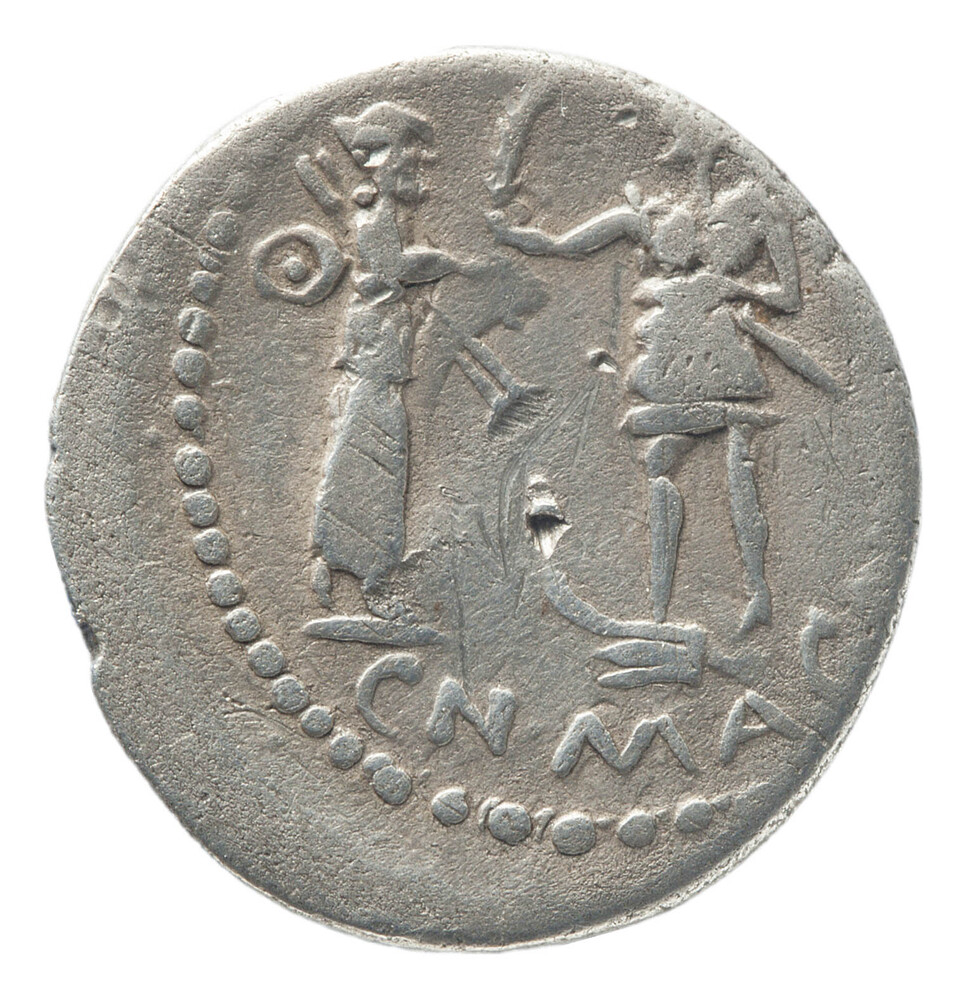 Denarius uit de Romeinse Republiek op naam van Gnaeus Pompeius junior