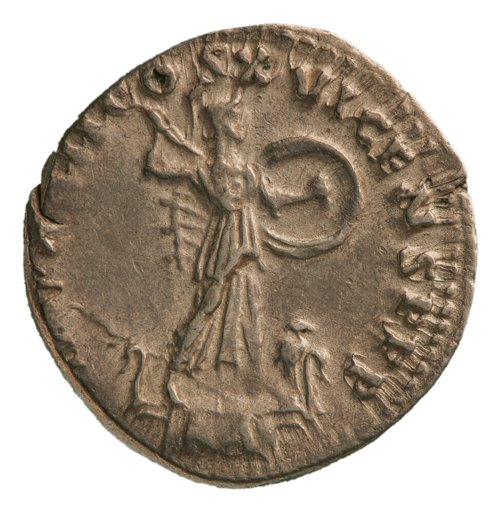 keerzijde: Minerva (Athena), naar rechts staand, houdt een schild vast in haar linkerhand en houdt een een speer vast in haar rechterhand. Ze staat op een columna rostrata. Rechtsonder bij haar voeten staat een uil.