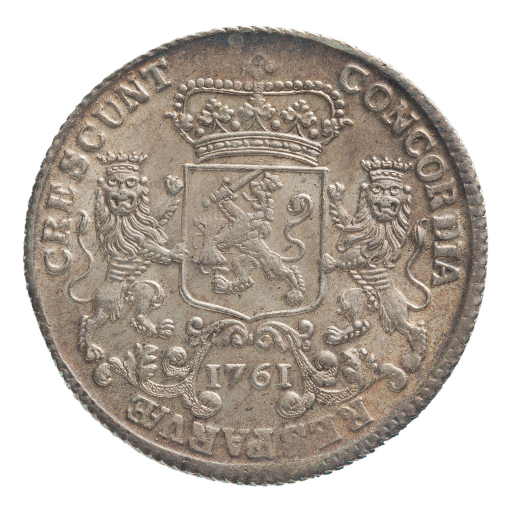 keerzijde: gekroond generaliteitswapen met twee gekroonde leeuwen als schildhouders, boven jaartal in cartouche