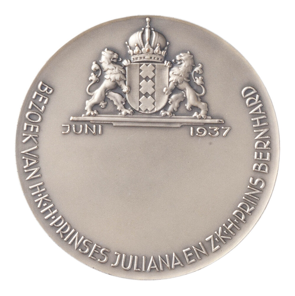 keerzijde: boven gekroond wawapen van Amsterdam, twee leeuwen als schildhouder, daaronder ruimte voor inscriptie [ongegraveerd]