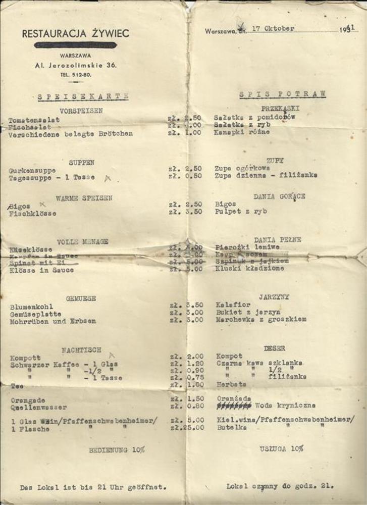 Menukaart restaurant Warschau 17 oktober 1941 Duits/...